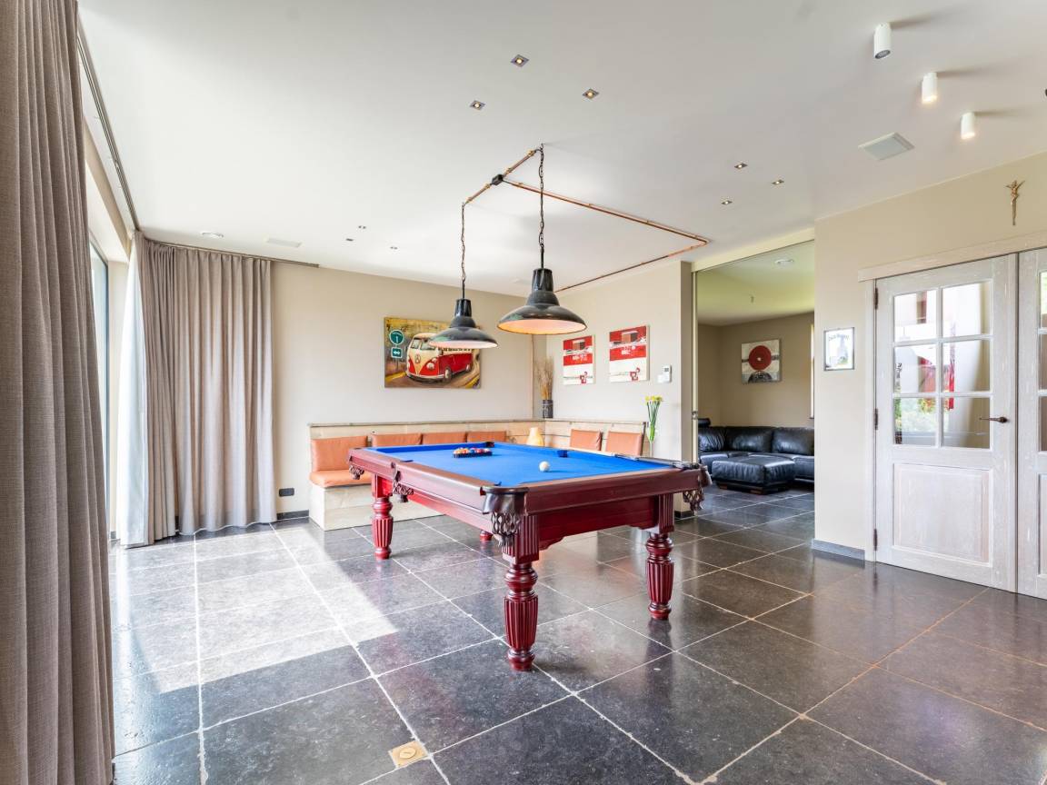 Layout : Parterre: Eingang mit Toilette , Wohnzimmer mit TV(digital), Ofen(Holz), Sitzecke, Billard , Küche mit Esstisch(16 Personen), Kochplatte(4 Kochplatten, Induktion), Dunstabzugshaube, Kaffeemaschine(Espresso, Filter), Backofen, Kombi-Mikrowelle, Geschirrspüler, Kühlschrank, Kühlschrank , Badezimmer mit Dusche, Waschbecken , Wirtschaftsraum mit 2x Waschmaschine
