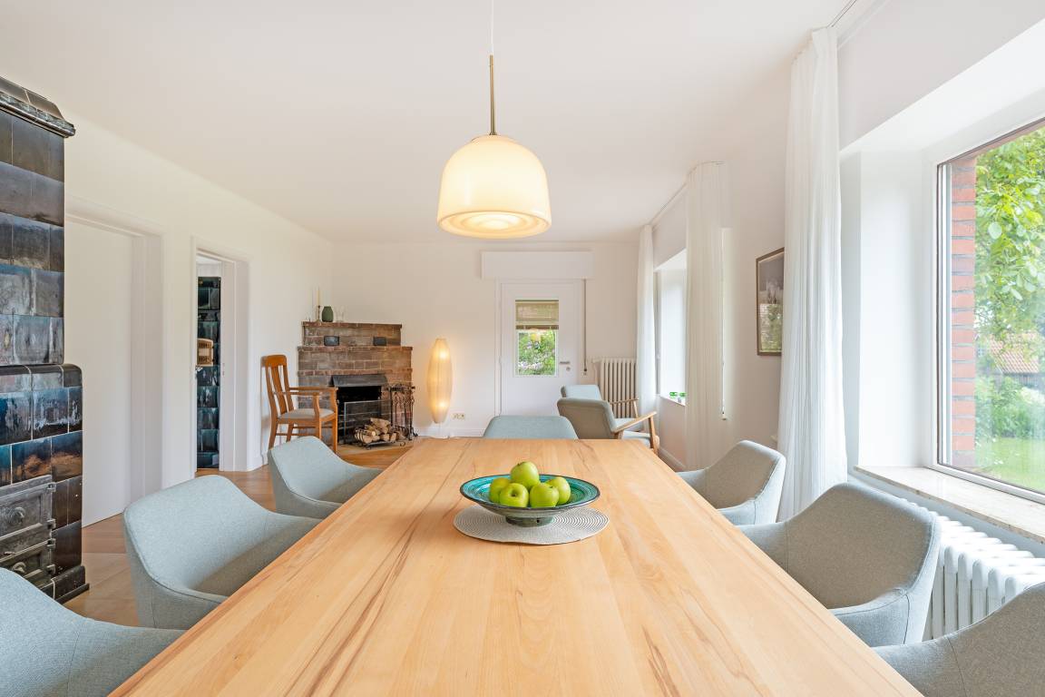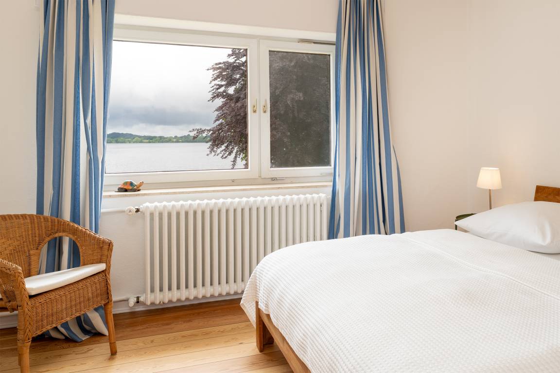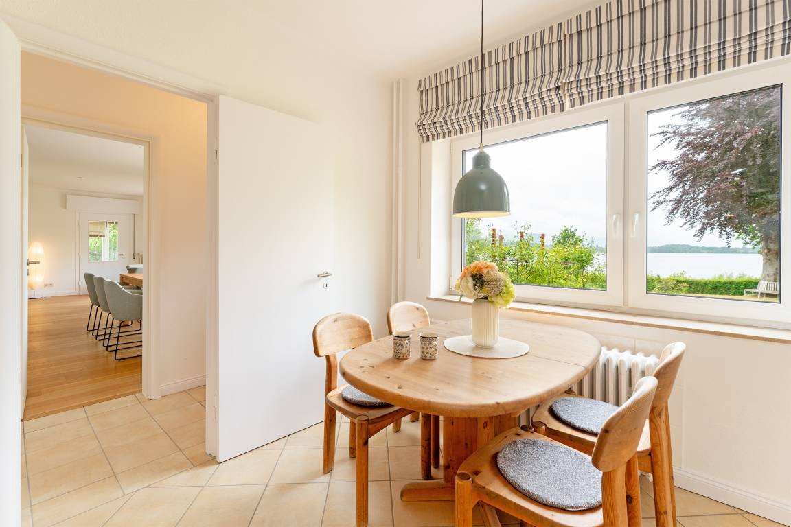 Der helle Wohnbereich mit Kaminofen lädt zu entspannten Abenden ein. Großzügige Fensterfronten eröffnen den Blick ins Grüne und auf den nahegelegenen See. Direkt angrenzend genießen Sie auf der nach Westen ausgerichteten Terrasse sonnige Nachmittage oder lauschige Abende. Gartenmöbel, ein Sonnenschirm und ein Strandkorb stehen Ihnen zur Verfügung. Die separate Küche ist hochwertig ausgestattet: Ceranfeld, Backofen, Mikrowelle, extra Gefrierschrank, Kühlschrank, Kaffeemaschine, Toaster und Wasserkocher lassen keine Wünsche offen. Gemeinsam speisen Sie in einem separaten Essbereich mit Ausblick auf das Seegeschehen. Fünf Schlafzimmer bieten Platz für bis zu acht Personen und sind gemütlich und stilvoll eingerichtet. Zwei Bäder im Obergeschoss sorgen für Komfort: eines ist mit einer Dusche, das andere mit einer Badewanne ausgestattet. Zwei Gäste-WCs im Erdgeschoss runden das Angebot ab.