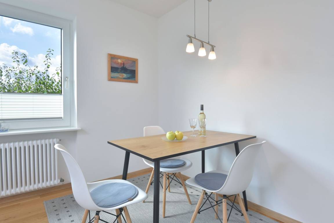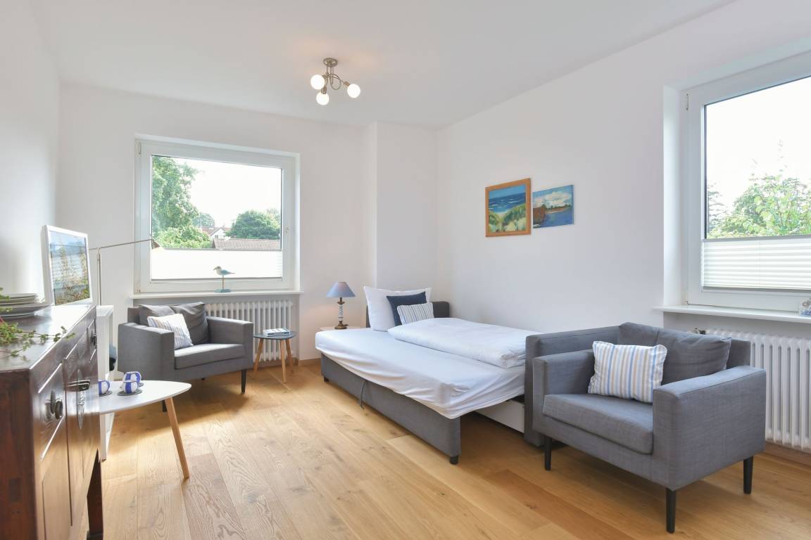 Das Wohnzimmer ist geschmackvoll mit Schlafsofa (Liegefläche ca. 160x200cm) und zwei Sesseln sowie Flatscreen-TV möbliert, Plissees sorgen für angenehmen Licht- und Sichtschutz. Ein Essplatz für drei mit Blick ins Grüne ist in den Wohnbereich integriert. Ein WLAN-Anschluss ist inklusive.