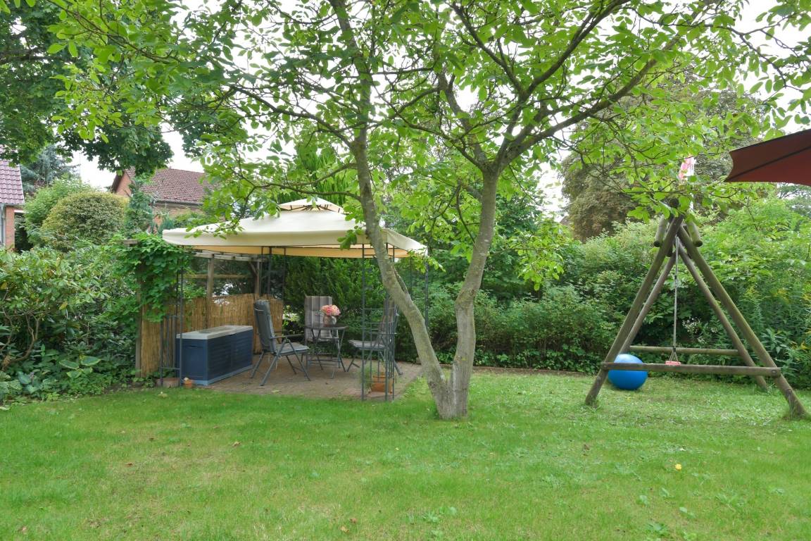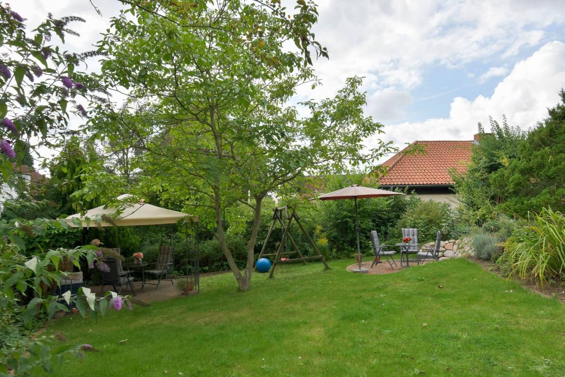Im malerisch angelegten Gemeinschaftsgarten stehen zwei gemütliche Sitzecken und eine Kinderschaukel zur Nutzung für alle Gäste bereit.