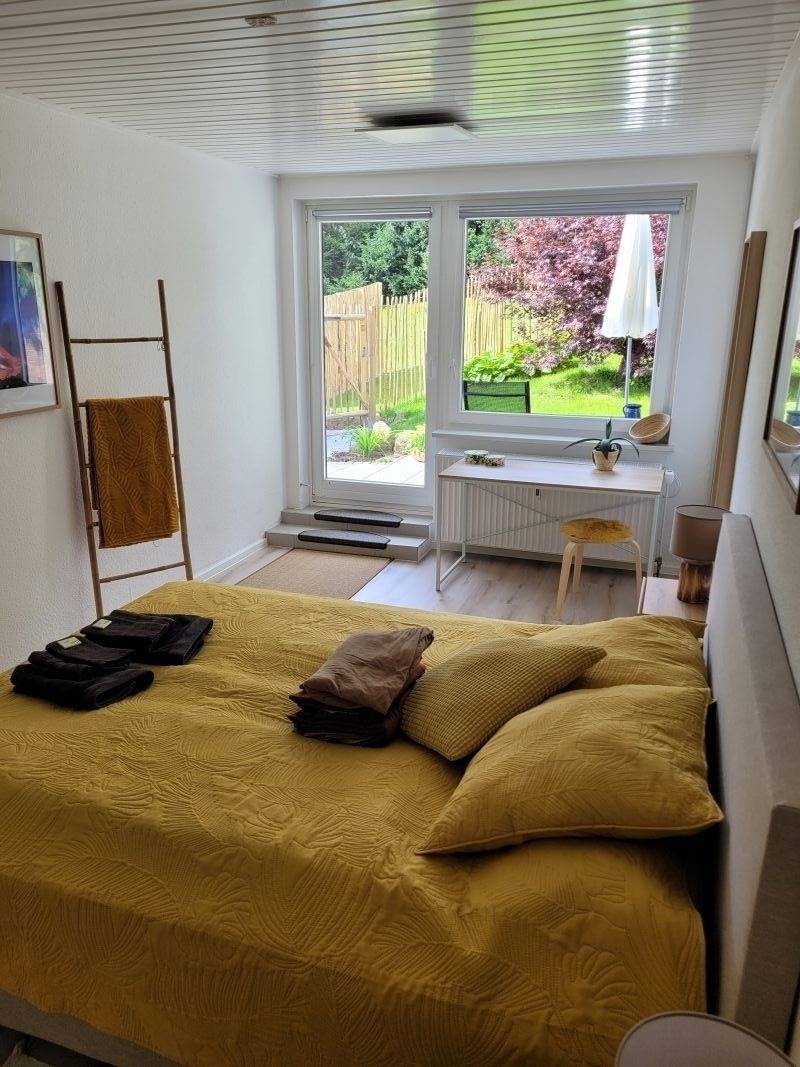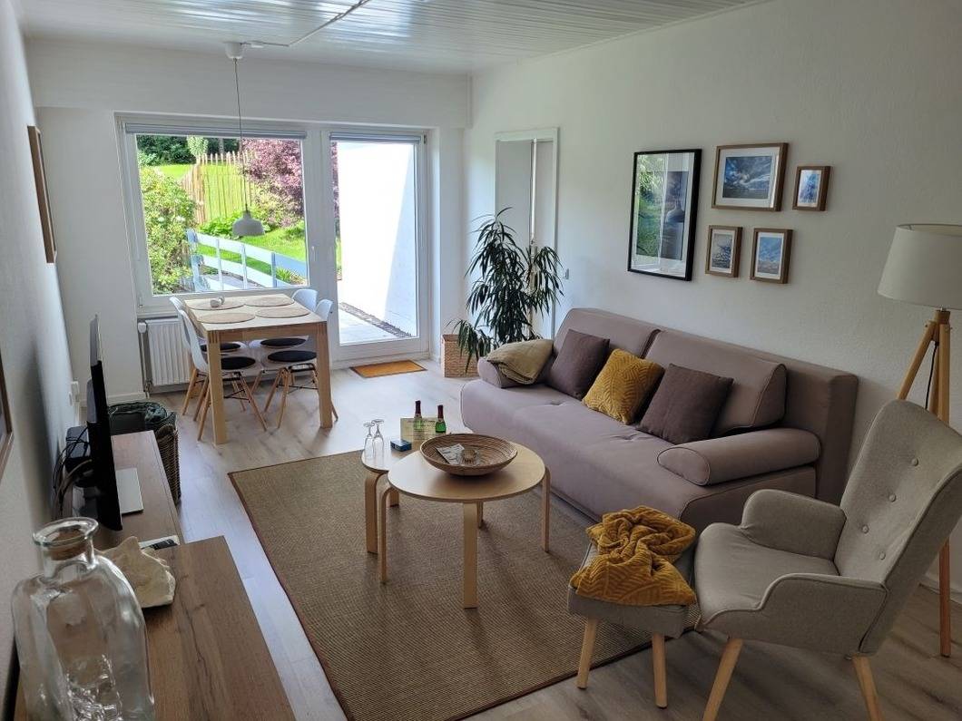 In unserer barrierefreien 2- Zimmer Ferienwohnung wohnen Sie komfortabel und gemütlich mit vollausgestatteter Küche und einem modernen Duschbad. Im Wohnzimmer befindet sich ein großes Schlafsofa (2m x 1,6m). Auf der sonnigen, eigenen Terrasse genießen Sie den unverbauten Blick in unseren großzügigen Garten.