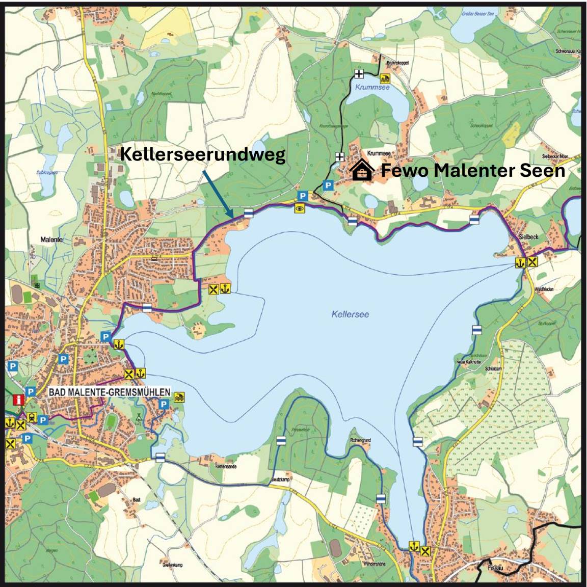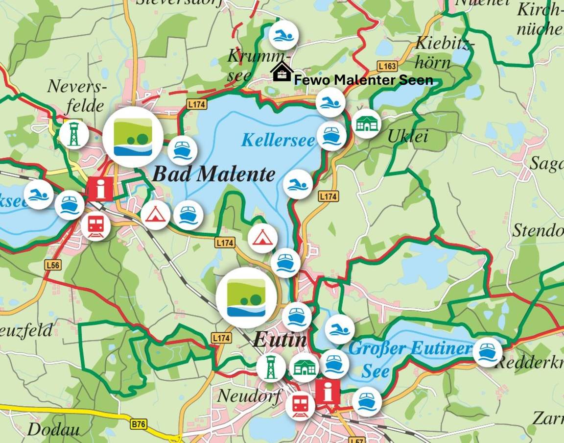 Diese können Sie auf den vielen Seen der Umgebung ausprobieren. Bad Malente Krummsee ist ein Ausgangspunkt für ausgedehnte Wanderungen, Boots-, Paddel-, Fahrrad- oder Motorradtouren. Die 20 min. entfernte Lübecker und Hohwachter Bucht locken mit weitläufigen Stränden und schönen Ostseepromenaden.