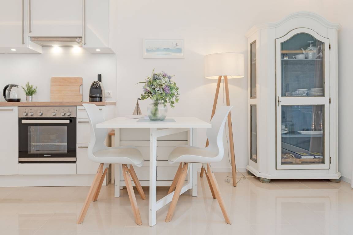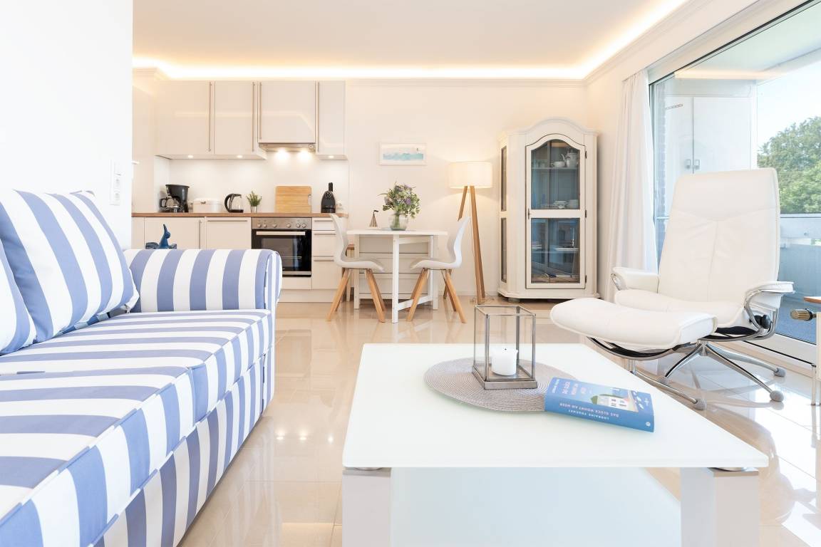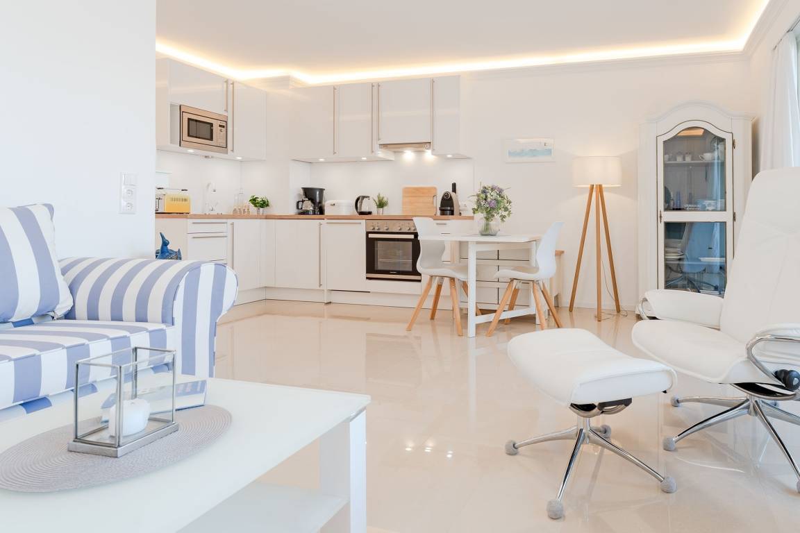 Bequem via Fahrstuhl erreichen Sie Ihr Feriendomizil im 1. OG der Ferienwohnungsanlage Haus Dieksee Holm. Über den Flur gelangen Sie direkt in den modern-maritim eingerichteten Wohn-Essbereich. Ein gemütliches Sofa und ein Stressless-Sessel laden zum Relaxen und zum Seeblick genießen ein. Die sehr gut ausgestattete Hochglanzküche ist in den Wohnbereich integriert und lässt mit Ceran-Kochfeld, Spülmaschine, Backofen und Mikrowelle keine Wünsche offen. Weiter geht es in das Schlafzimmer, welches mit einem bequemen Doppelbett (2x 80x200cm) für einen erholten Schlaf im Urlaub sorgt. Angrenzend an die Küche befindet sich das hell geflieste, kleine Tageslicht-Duschbad. Beide Räumlichkeiten lassen sich zur Nacht angenehm abdunkeln. Überzeugen wird Sie der traumhafte Ausblick auf den Dieksee, den Sie direkt vom Wohnzimmer oder vom überdachten Balkon aus genießen können. Machen Sie es sich an der frischen Luft auf den Balkonmöbeln oder der bequemen Rattancouch gemütlich.