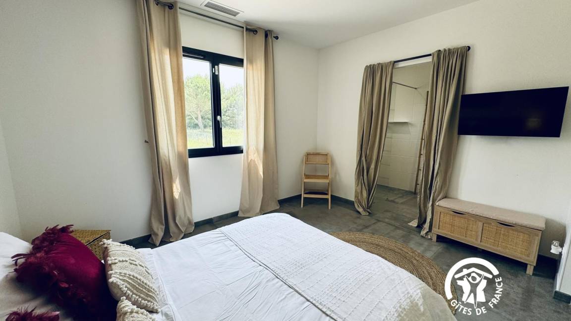 _Ein Schlafzimmer mit einem 140 cm Bett mit Fernseher, Kleiderschrank, mit direktem Zugang zum Badezimmer,