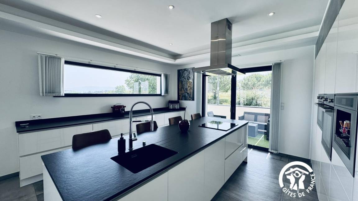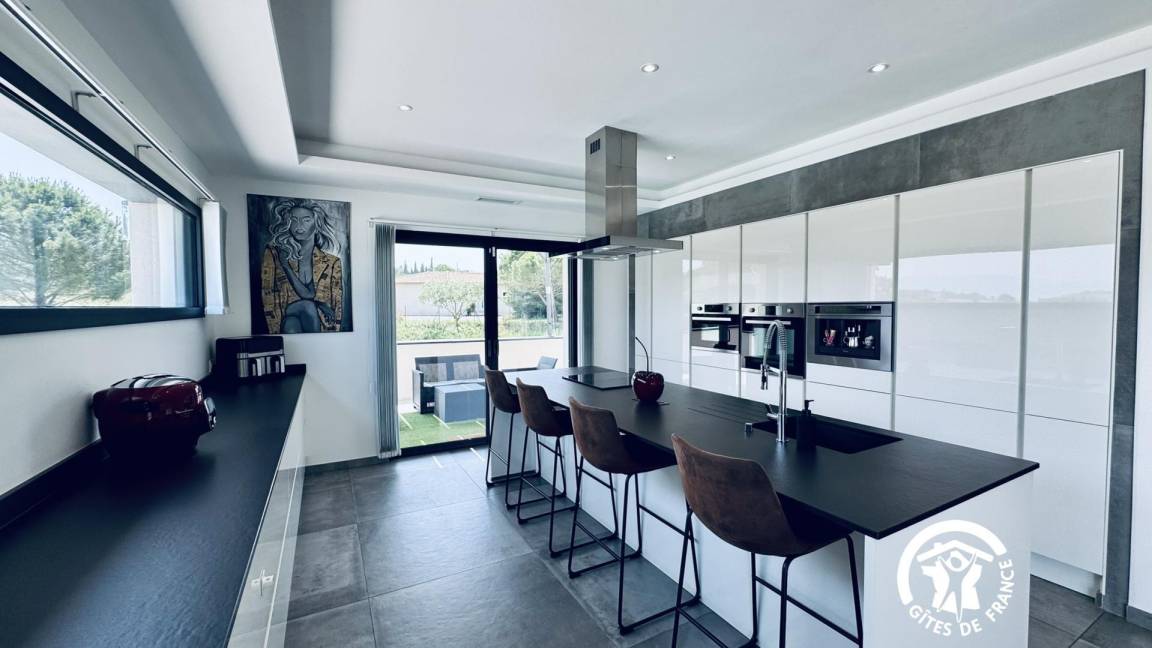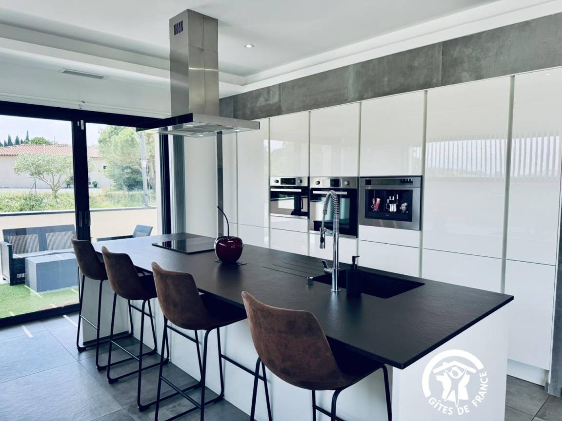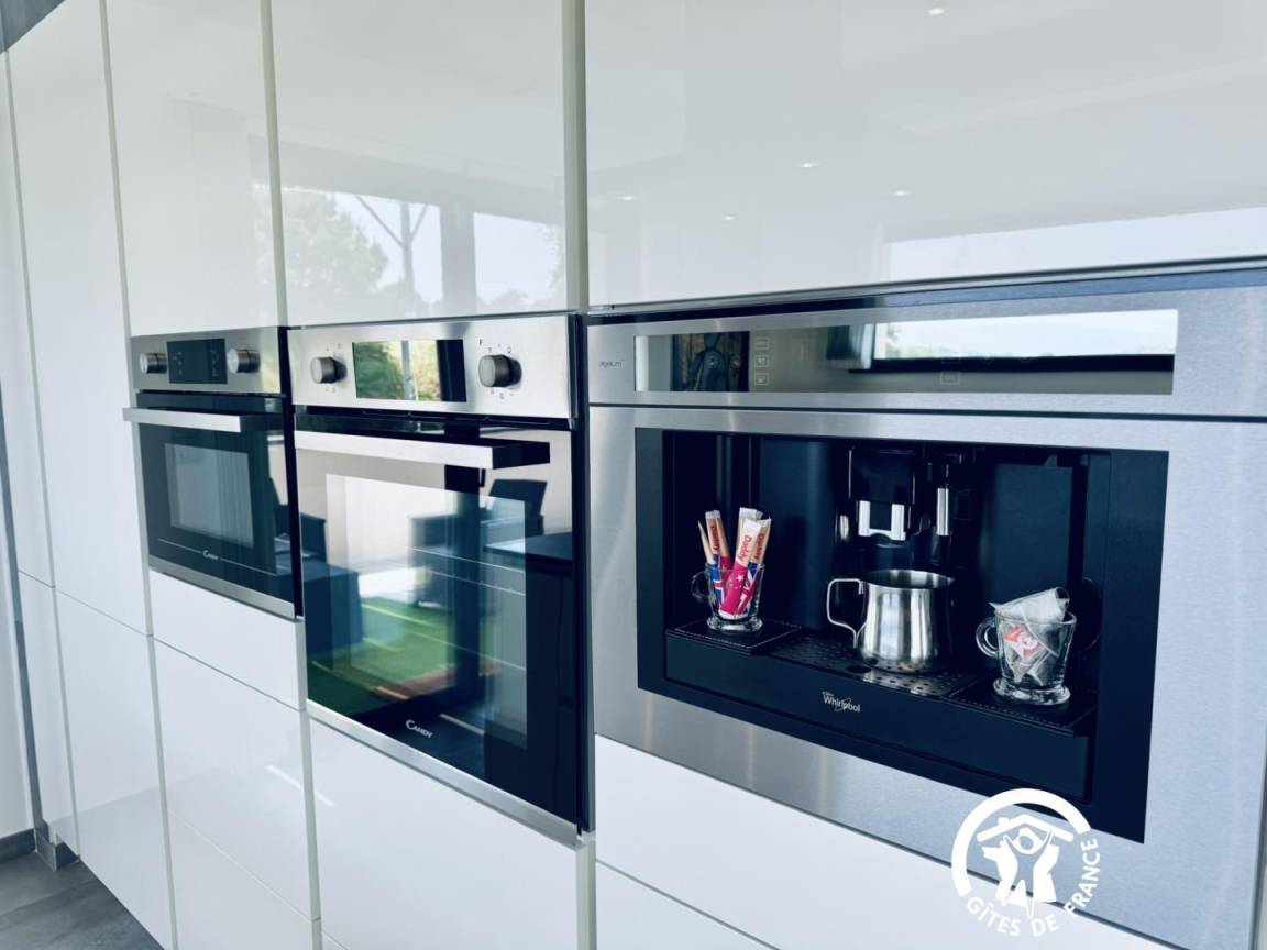 Teffekten sowie ein offener, ausgestatteter Küchenbereich (Induktionskochfeld, Dunstabzugshaube, Backofen, Mikrowelle, integrierte Kaffeemaschine, Geschirrspüler, Cookéo, Airfryer),