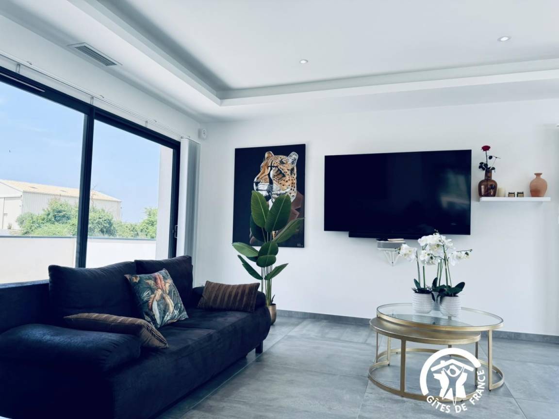 _ Ein heller, mit einzigartigen Werken dekorierter Wohnbereich, ein Loungebereich mit angeschlossenem Fernseher, Lautsprecher und Lich