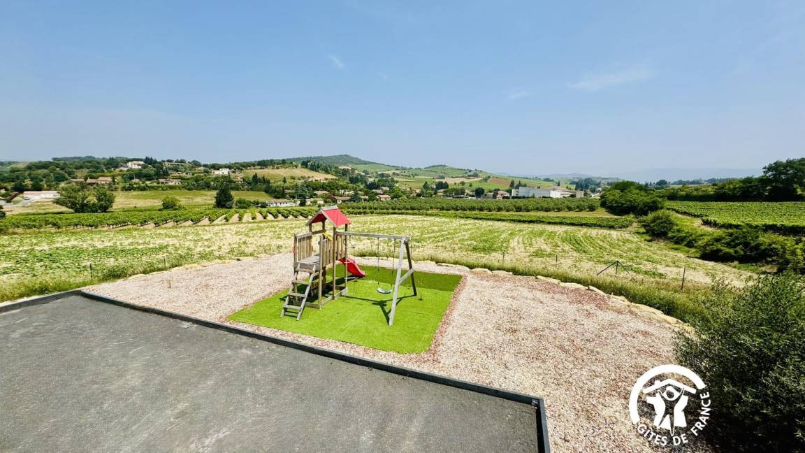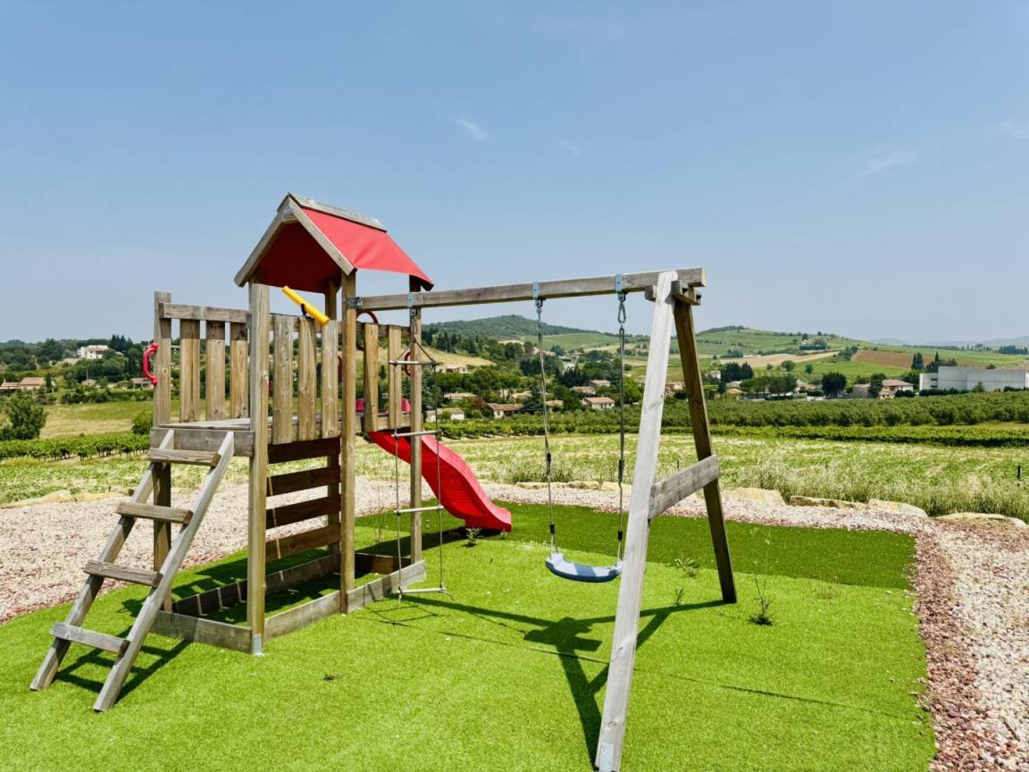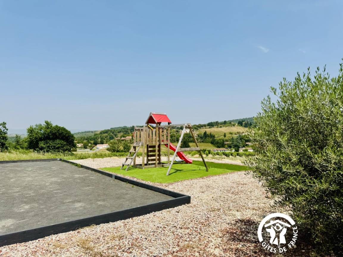Garten mit Pétanque-Platz, Sportgeräten und Kinderspielen. Grill.