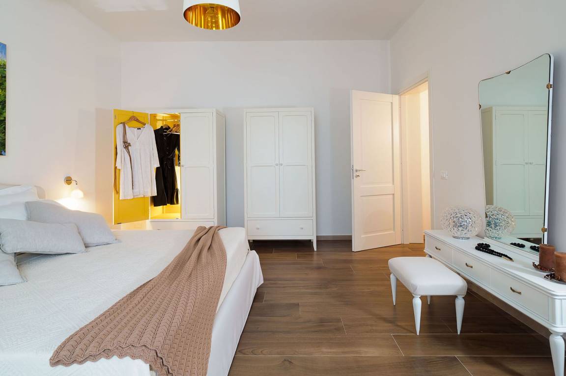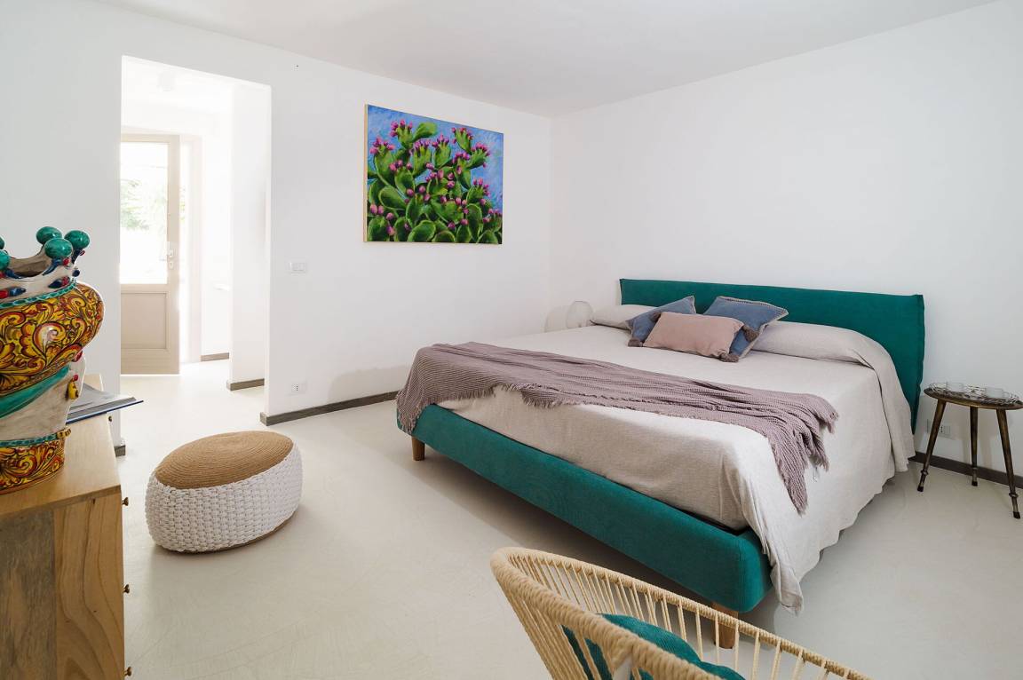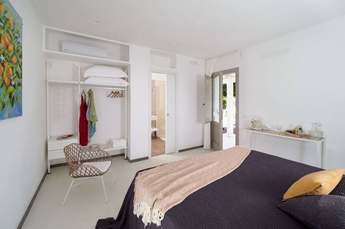 Schlafzimmer mit Bad 1: großes Doppelbett, WiFi Internet, Internet, Klimaanlage, Sessel, Waschbecken, WC, Bidet, Dusche, Fön, Ausgang auf die Terrasse.