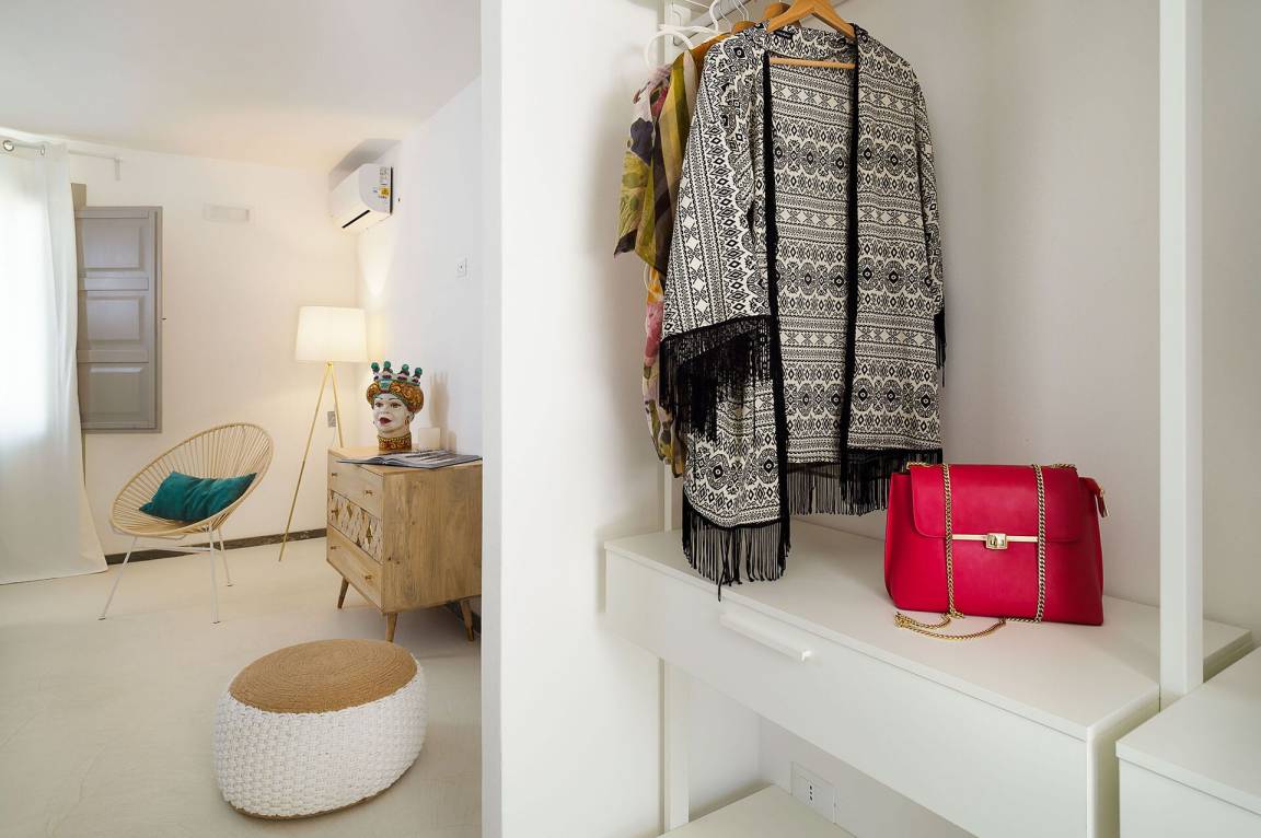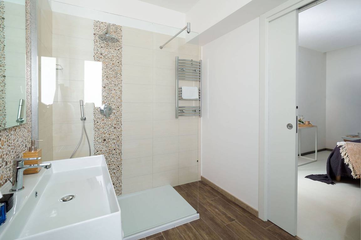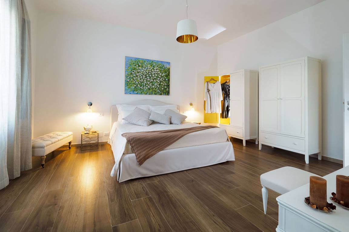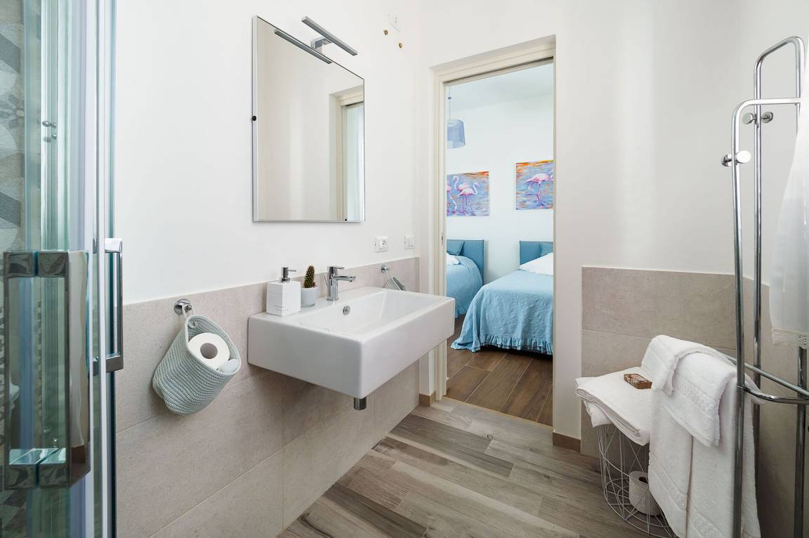 Schlafzimmer mit Bad 1: großes Doppelbett, WiFi Internet, Internet, Klimaanlage, Sessel, Waschbecken, WC, Bidet, Dusche, Fön, Ausgang auf die Terrasse.