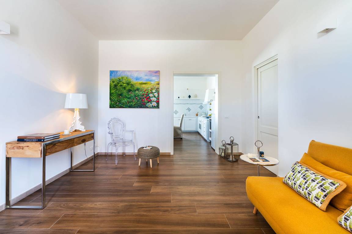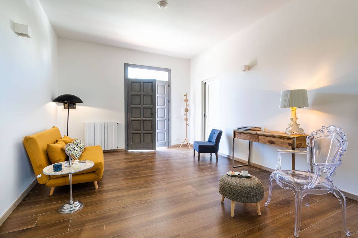 Wohnzimmer 1: Sofa (Personen: 3), Schreibtisch, WiFi Internet, Internet, Ausgang auf die Terrasse.