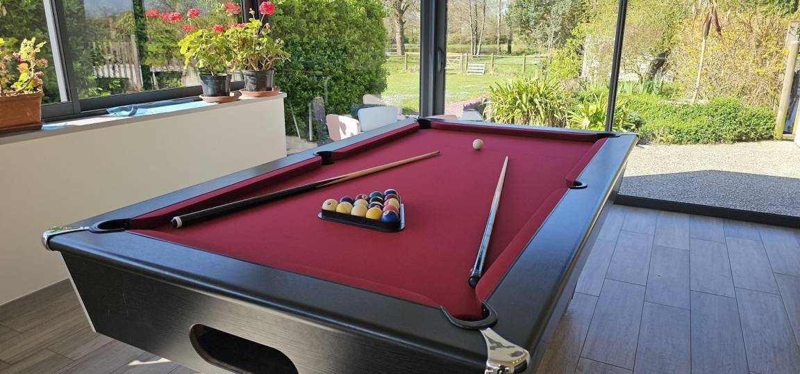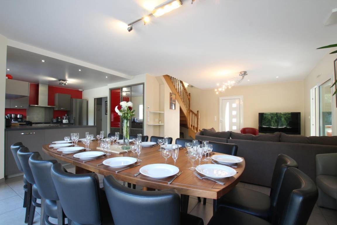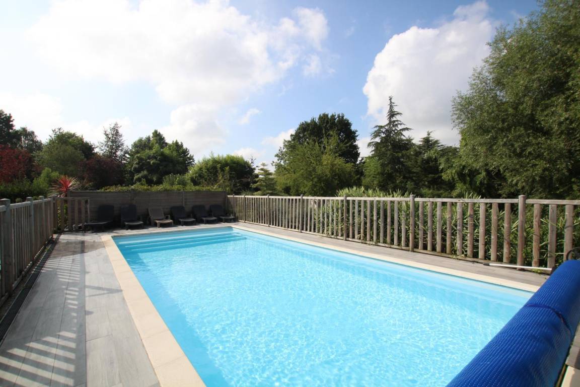 Freistehendes Haus in einem privaten Landschaftspark mit See. Wohnzimmer. Küche. Veranda mit Billard und Tischfußball. Duschraum mit WC für Personen mit eingeschränkter Mobilität angepasst. Separates WC. Schlafzimmer 1 (Queensize-Bett). Schlafzimmer 2 (Queensize-Bett + Einzelbett). Waschküche. Obergeschoss: Schlafzimmer 3 (Doppelbett), Schlafzimmer 4 (3 Einzelbetten), 2 Duschräume mit WC, Schlafzimmer 5 (2 Einzelbetten), Schlafzimmer 6 (Doppelbett). Babyausstattung. Fernseher. Blu-ray DVD. Hi-Fi-Anlage. WLAN. Waschmaschine. Wäschetrockner. Gefrierschrank. Bettwäsche und Handtücher zu mieten. End- und Zwischenreinigung auf Anfrage. Elektroheizungspaket (Fußbodenheizung im Erdgeschoss). Terrasse. Gartenmöbel. Sonnenliegen. Grill. Beheizter Swimmingpool (10 m x 4 m) von April bis Oktober. Pétanque-Platz. Tischtennisplatte. Sicherer Fahrradabstellplatz. Parkplatz. Raum für Telearbeit (Schreibtisch, Stuhl, Lampe, Steckdosen). Empfang für alle Betreiber.