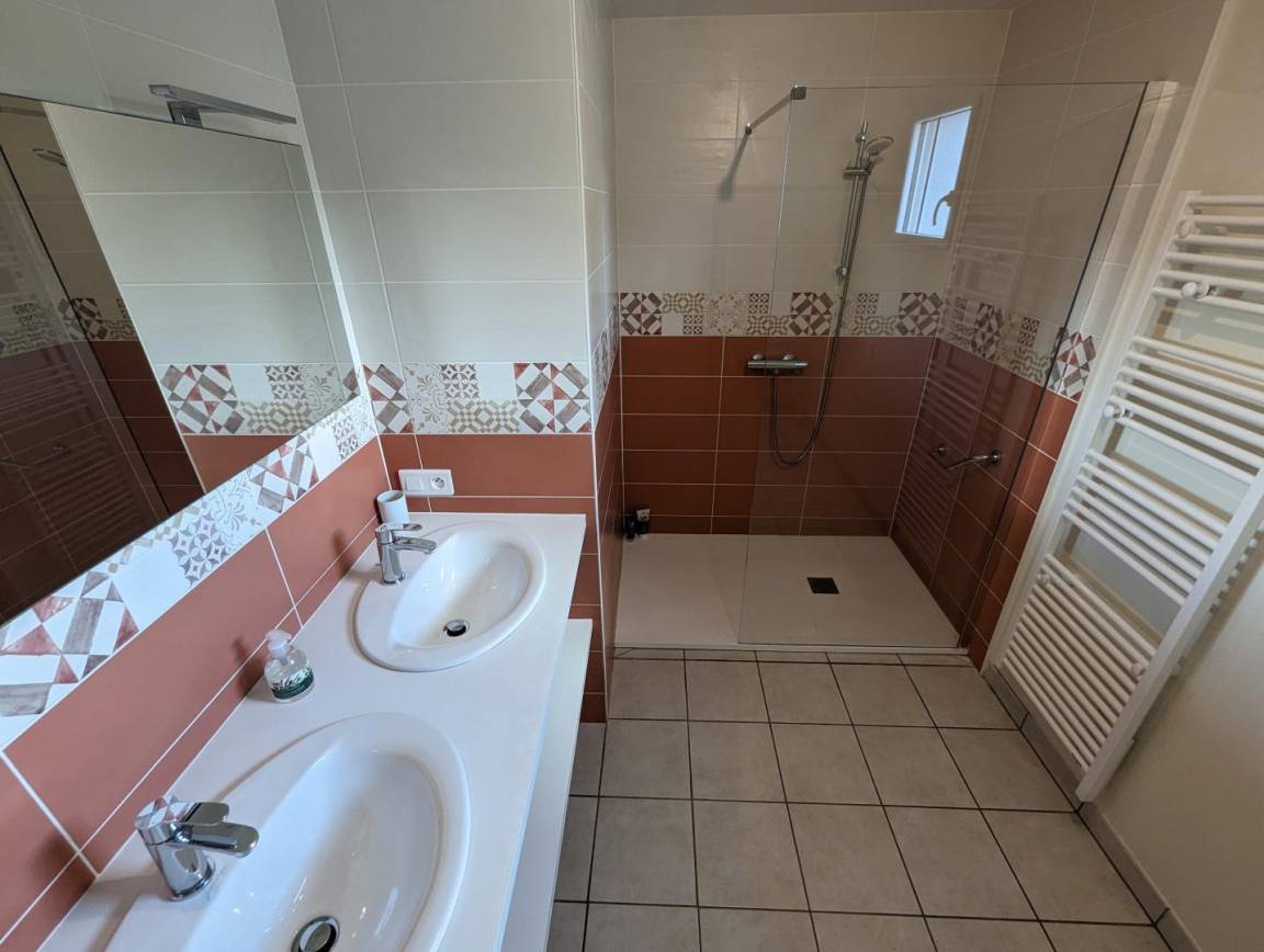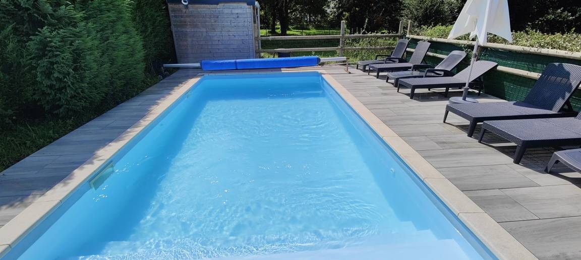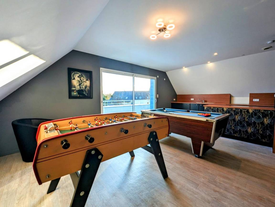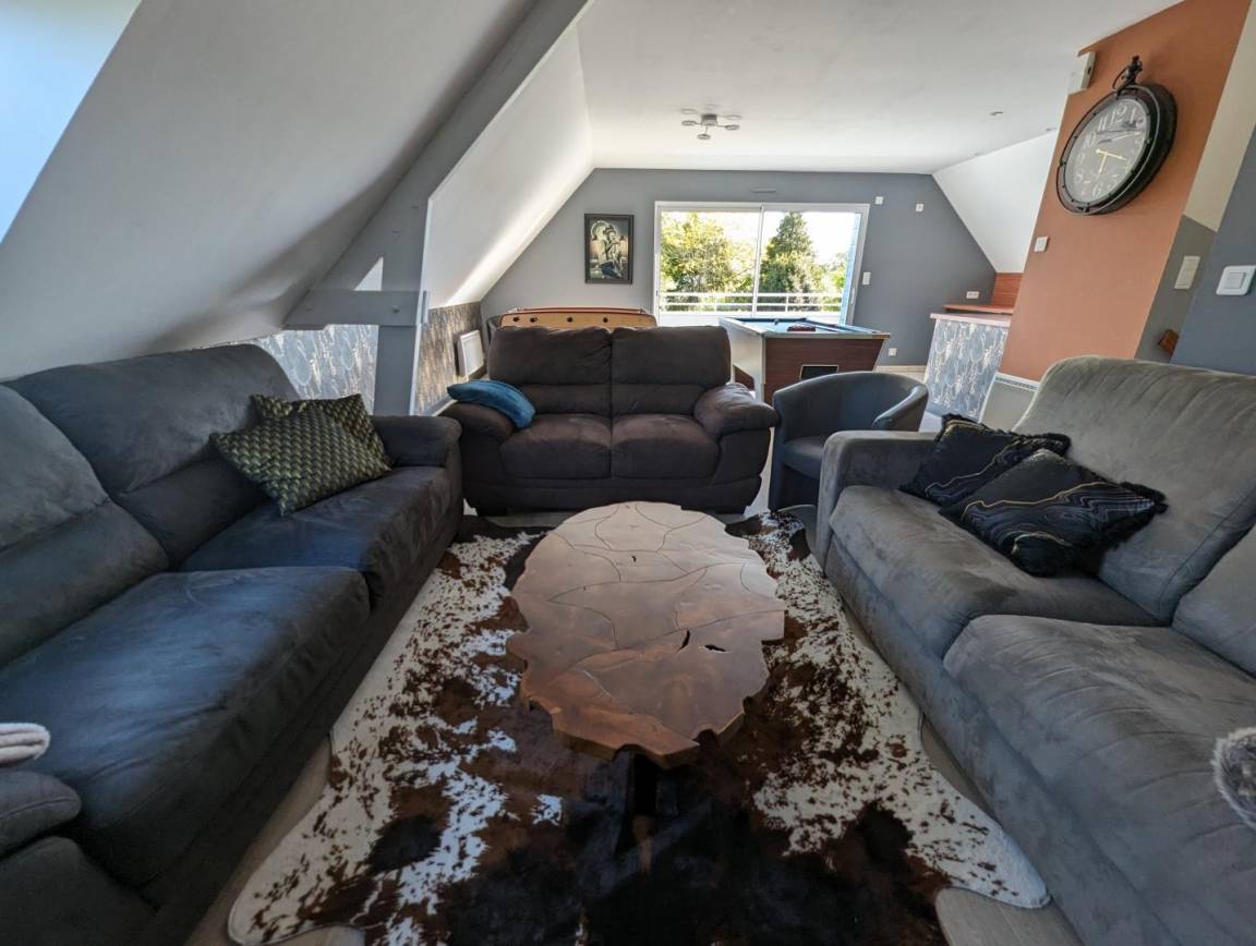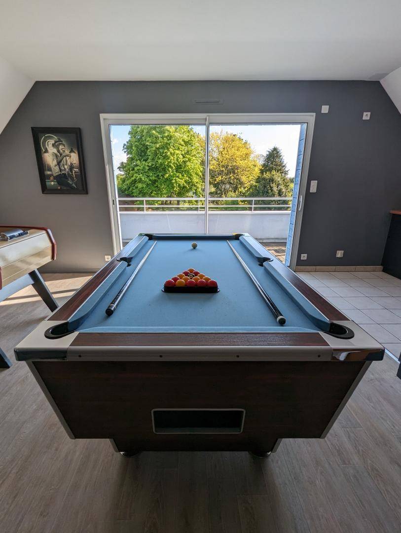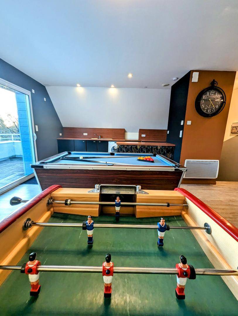 Modernes Haus mit privatem beheiztem Pool. Wohnzimmer, ausgestattete Küche (Kochherd, Geschirrspüler, Gefrierschrank, Mikrowelle...). Essbereich mit Holzofen. Schlafzimmer 1 (160X200). Schlafzimmer 2 (2x90x190 und 80x190). S. Wasser. Balneotherapiebereich: Sauna, Außenwhirlpool (ganzjährig zugänglich). Im 1. Stock Wohnzimmer, Entspannungsbereich (TV, Blue-Ray-DVD, WiFi-Internet, Billard, Tischfußball) mit Zugang zu einer Balkonterrasse (12 m²). Waschküche (Wäsche, Wäschetrockner). Toilette. S. Wasser. Schlafzimmer 3 (160X200). Schlafzimmer 4 (160X200 und 90X190). Im Obergeschoss über dem Wellnessbereich befinden sich Schlafzimmer 5 (2x90x190+ 140x200), WC, Duschbad und Schlafzimmer im Zwischengeschoss (90x190). Babyausstattung. Bettwäsche und Handtücher können gemietet werden. Zusätzlicher Reinigungsservice. Elektroheizung ink. Privater umzäunter Garten. 1 große Terrasse. Gartenraum. Privater Pool, beheizt von Mai bis September (8 x 4 m). Grill. Tischtennis. Abschließbarer Fahrradraum.
