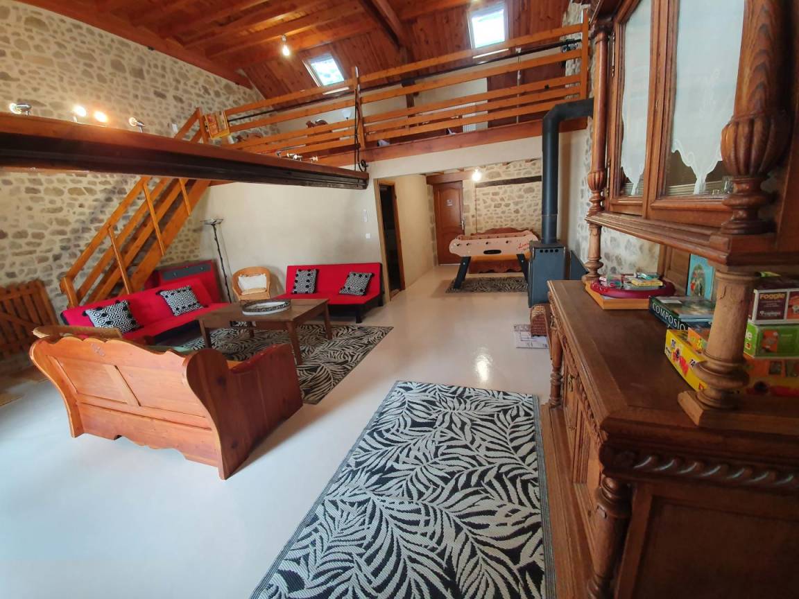 In einem Weiler, großes freistehendes Haus aus unverputztem Stein, eingerichtet in einem alten Bauernhof, in der Nähe des Hauses der Eigentümer. Erdgeschoss: große Küche mit Essbereich, großes Wohnzimmer mit Tischfußballplatz, Kaminofen, 1 Schlafzimmer (1 Bett 160x200), Duschbad (Dusche), separates WC, Duschbad (Dusche/WC). Obergeschoss: 1 Schlafzimmer (1 Doppelbett), 1 Schlafzimmer (1 Doppelbett), 1 Schlafzimmer (1 Doppelbett), Mezzanine (2 Betten 115x185, 2 Einzelbetten). WLAN-Zugang. Ölverbrauch: zusätzlich Zentralheizung und Warmwasserbereitung. Eingezäunte Grünfläche, schattige Terrasse. Néris-les-Bains 20 km. Evaux-les-Bains 15 km. Vulkane der Auvergne 50 km.