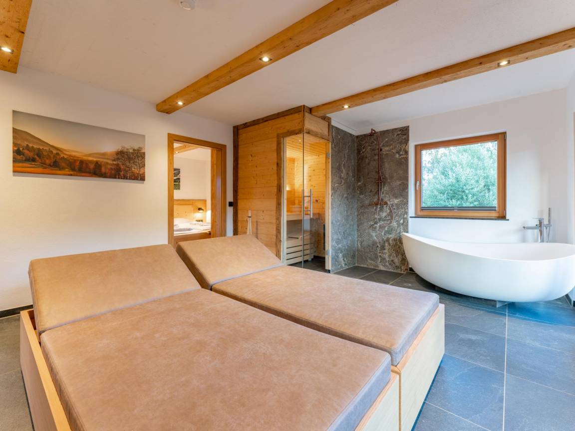 In der 1. Etage: 2x Schlafzimmer mit Doppelbett(180 x 200 cm), TV(smart TV) , Badezimmer mit Dusche, Waschbecken, Toilette , Ruheraum mit Badewanne, Dusche, Sauna, 2x Liegestühle , Balkon