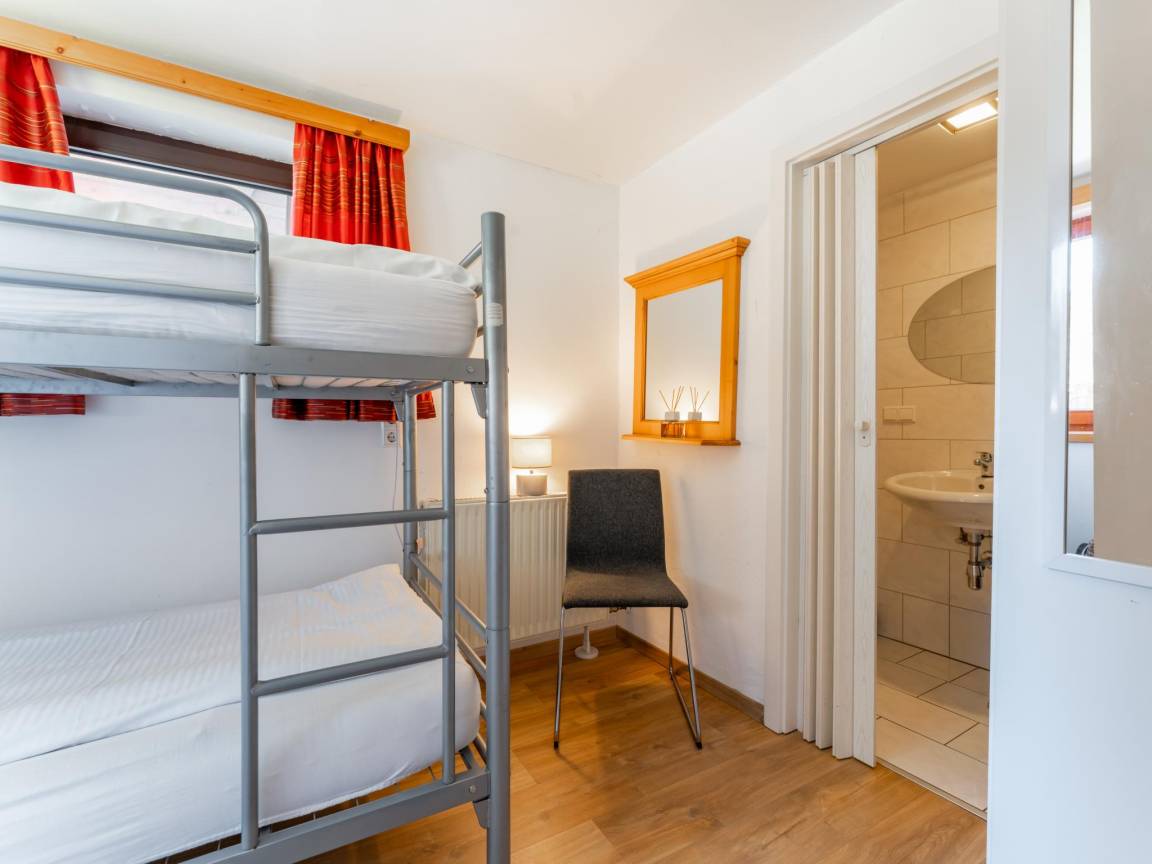 Layout : Parterre: Schlafzimmer mit Etagenbett , Badezimmer mit Dusche, Waschbecken, Toilette