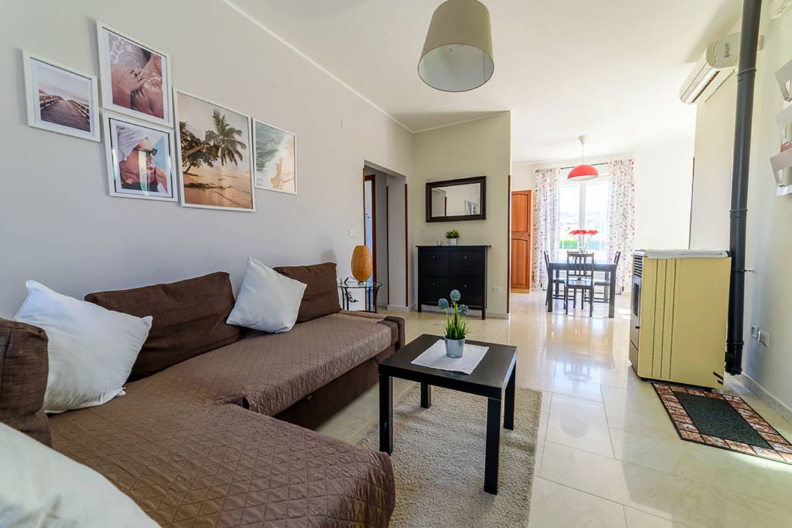 Die Wohnfläche der Villa Brigida misst komfortable 100 qm, die sich auf 2 Schlafzimmer (Doppelbett; Doppelbett + Einzelbett), zwei Bäder, einen offenen Wohnbereich mit Sofa und großem LCD-Fernsehgerät sowie Küchenzeile und Essbereich aufteilen.