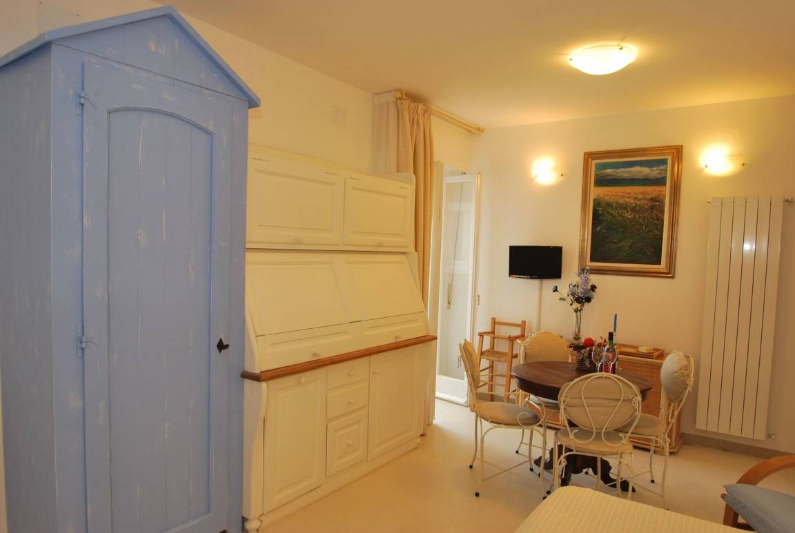 Wohnküche: gut ausgestattete Küche, zwei Esstische, Spülmaschine, Kühlschrank, Tiefkühler, Mikrowelle, Herd, Toaster, Bügeleisen, Italienische Kaffeemaschine, Amerikanische Kaffeemaschine, Sessel, Doppel-Schlafsofa, WiFi Internet, Klimaanlage, Satelliten-TV, TV, Ausgang auf den Balkon.
