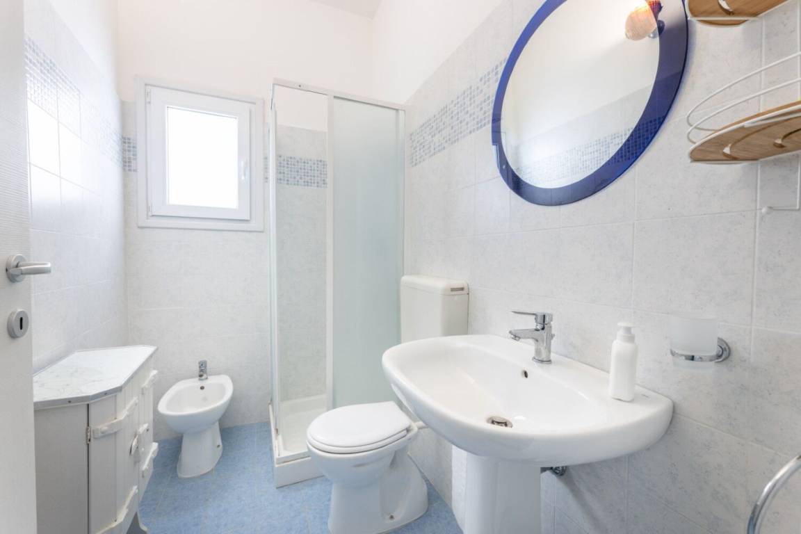 Badezimmer: Waschbecken, WC, Bidet, Dusche, Waschmaschine.