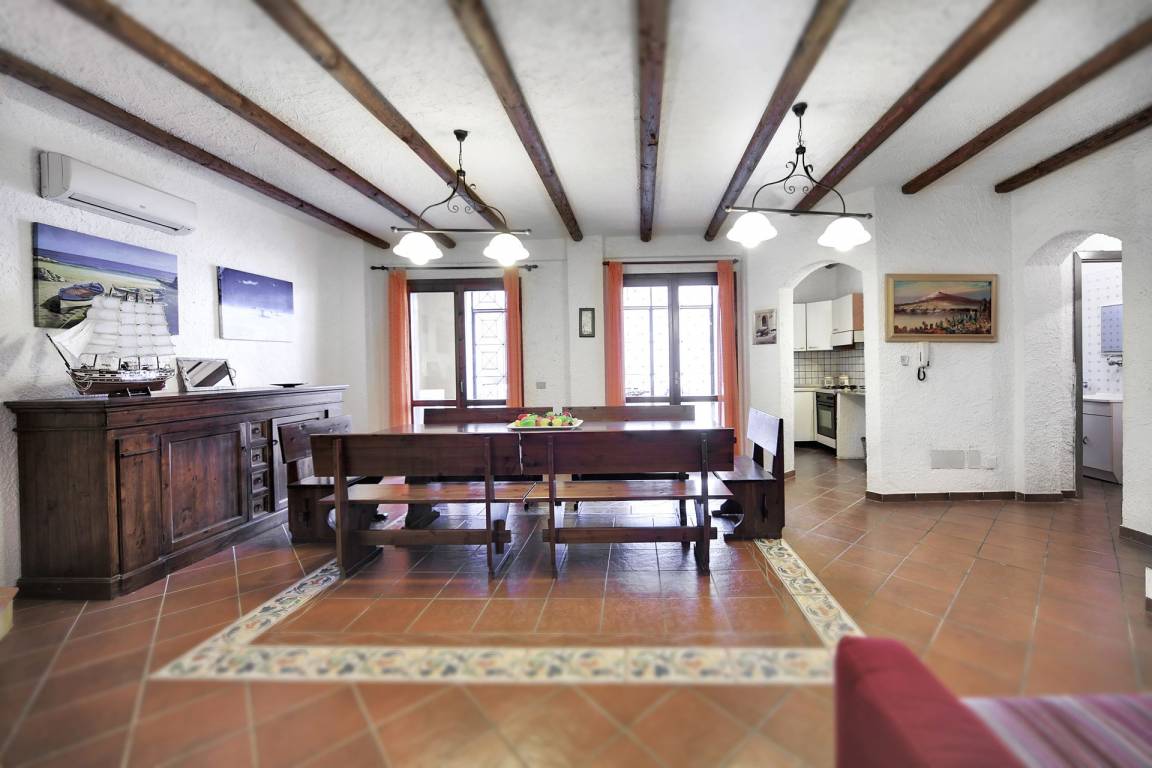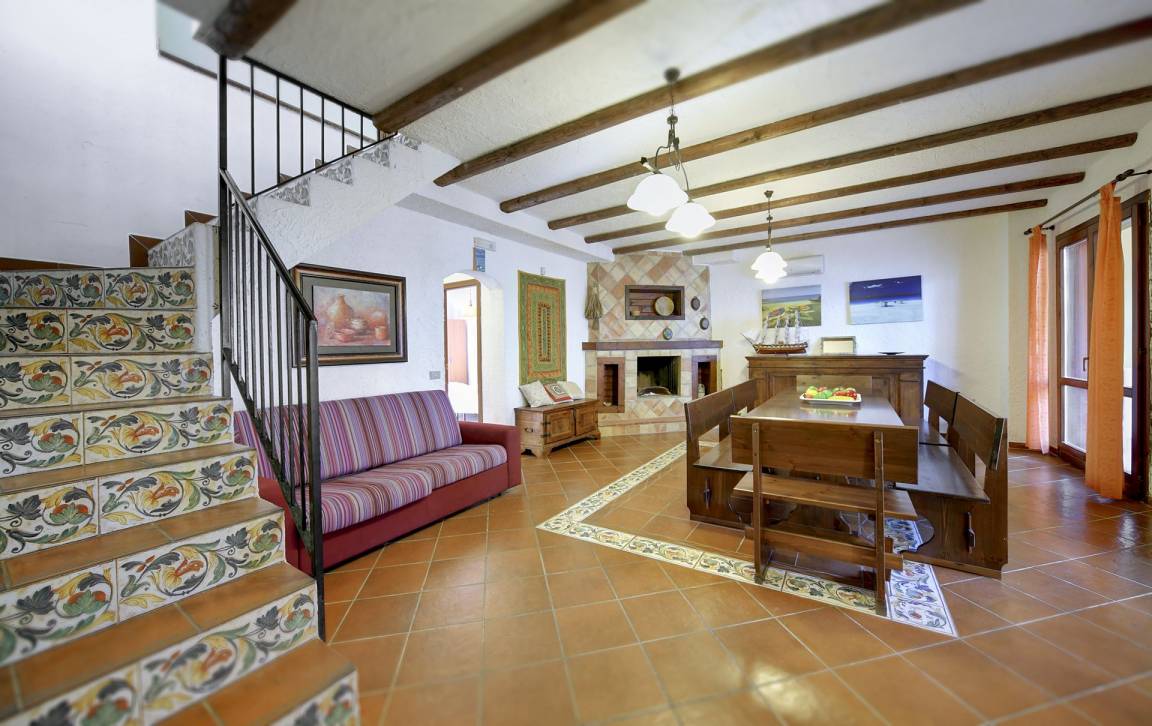 Wohnzimmer (25 m²): Kamin, Esstisch, Doppel-Schlafsofa, WiFi Internet, Klimaanlage, Ausgang auf die Veranda.