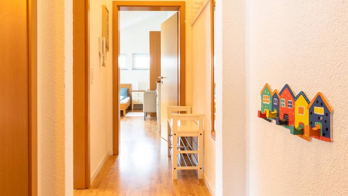 Gemütlicher Wohn- und Schlafraum für 2 Erwachsene und 2 Kinder mit großem Doppelbett und separatem Kinderzimmer mit Stockbetten, Badezimmer mit Dusche, WC, Föhn, Handtuchwärmer und Kosmetikspiegel, Einbauküche mit Plattenherd, Backofen, Mikrowelle, Kühlschrank und separater Gefrier-Einheit, Wasser-/Eierkocher, Kaffeemaschine und Toaster, Ausblick auf den Vorderhof. Lage: 1. OG