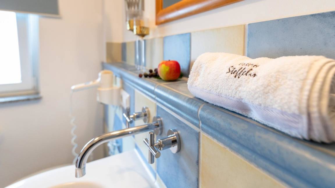 • Badezimmer mit Dusche, WC, Föhn, Handtuchwärmer und Kosmetikspiegel