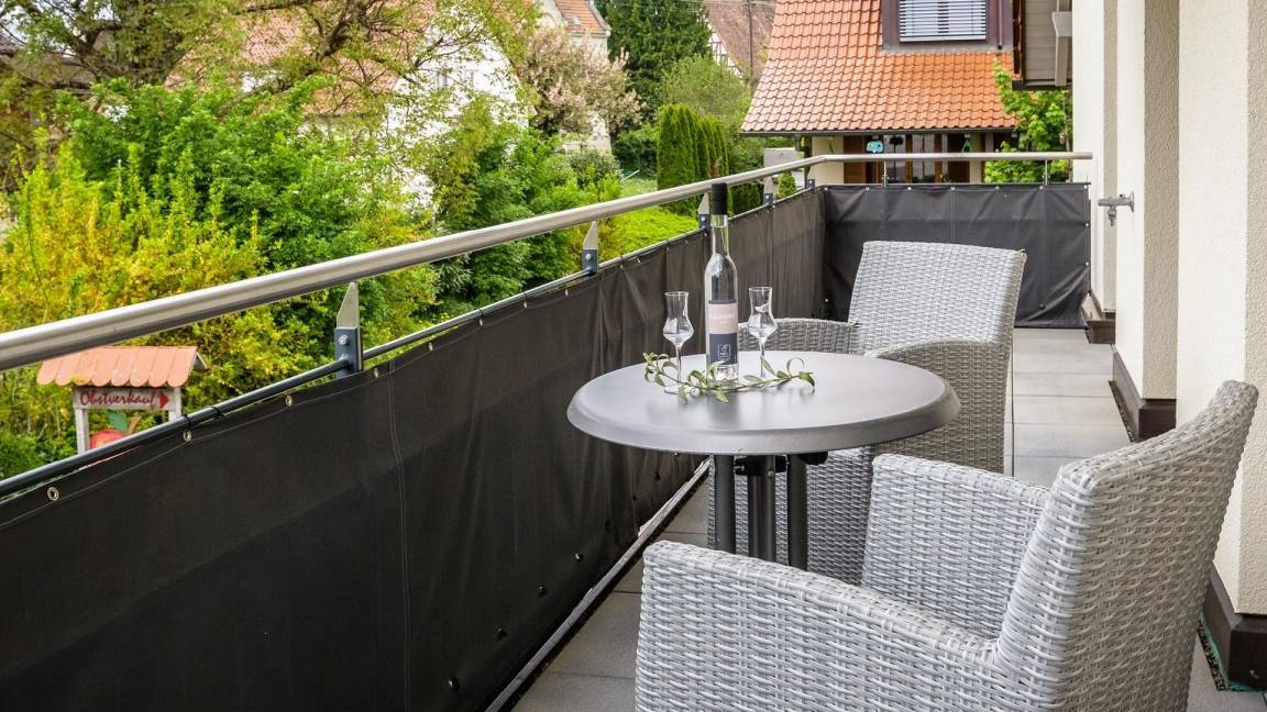 Helle Ferienwohnung für 2 Personen, Wohnraum mit Raumteiler für kombinierten Wohn-/Schlafraum und Küchenzeile (Zusatzbett möglich), Badezimmer mit Dusche, WC, Föhn und Handtuchwärmer, Einbauküche mit Ceranfeld, Spülmaschine, Kühlschrank + separate Gefrier-Einheit, Wasser-/Eierkocher, Kaffeemaschine und Toaster, Ausblick: Dorfsicht und in den Himbeergarten im hinteren Hof, Lage: 1. OG