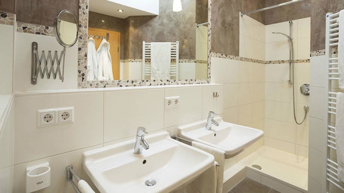 • Badezimmer mit 2 Waschbecken, Dusche, WC, Handtuchwärmer, Föhn und Kosmetikspiegel