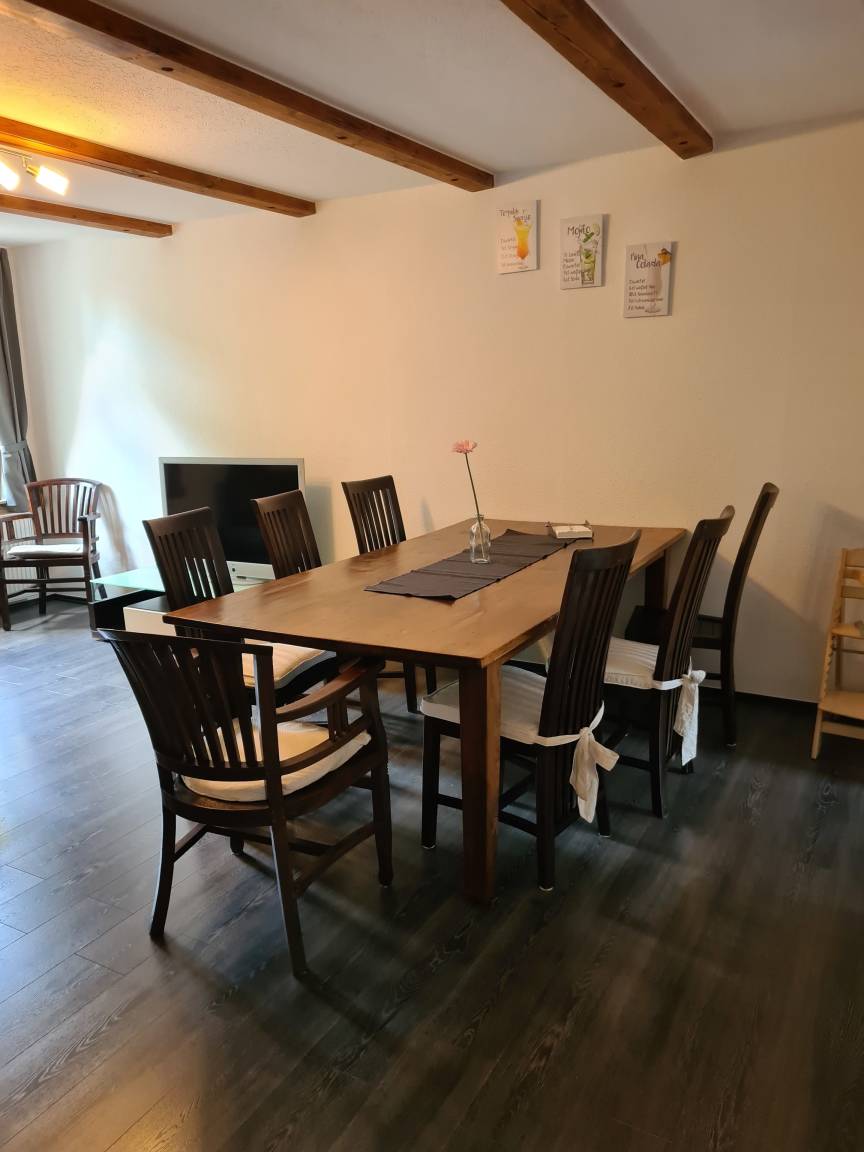 Der große Holztisch mit 10 gemütlichen Stühlen lädt zum Essen und Verweilen ein. Ein Hochstuhl für Kleinkinder und ein TripTrap-Stuhl für etwas ältere Kinder stehen selbstverständlich zur Verfügung. In einer Holzvitrine stehen weitere Gläser für Wein, Bier und Longdrinks. Verschiedene Gesellschaftsspiele sind ebenso vorhanden, wie eine Duplo-Steine-Kiste, Puzzles und Spiele für Kinder. Bücher für große und kleine Leute sind auch vorhanden. Das gemütliche Ecksofa ist ein idealer Platz um einen Tag bei einem Glas Wein ausklingen zu lassen. Der große Fernseher steht auf einem Fernsehschrank der Couch gegenüber. Das Sofa lässt sich problemlos in eine Schlafgelegenheit für zwei Personen herrichten. Ein Außenrollo kann den Raum jederzeit verdunkeln.