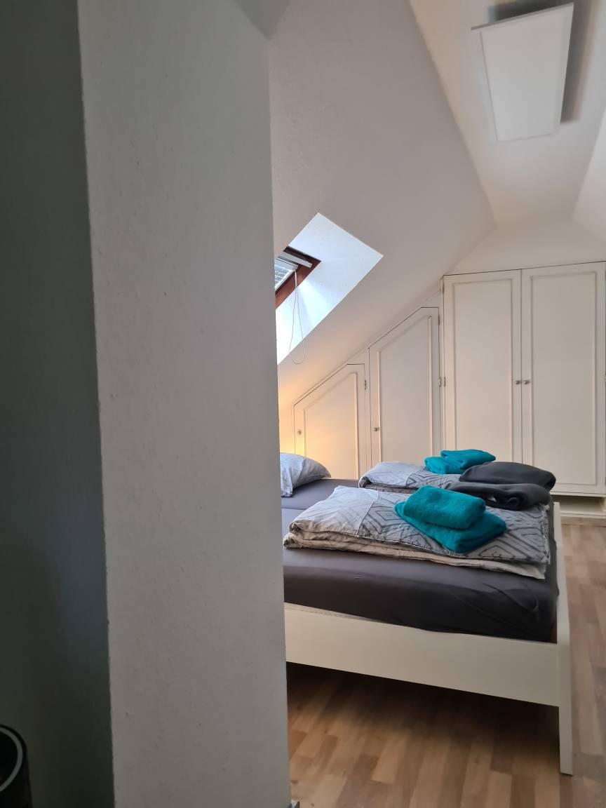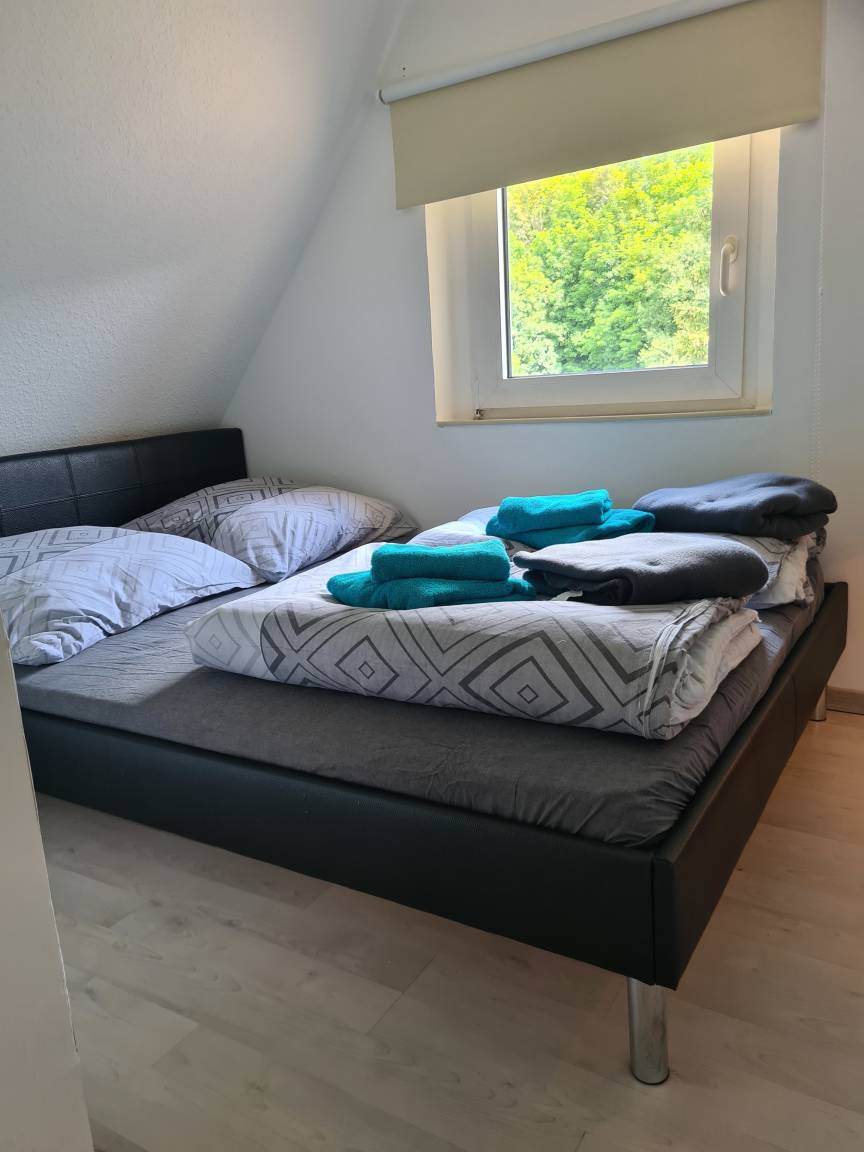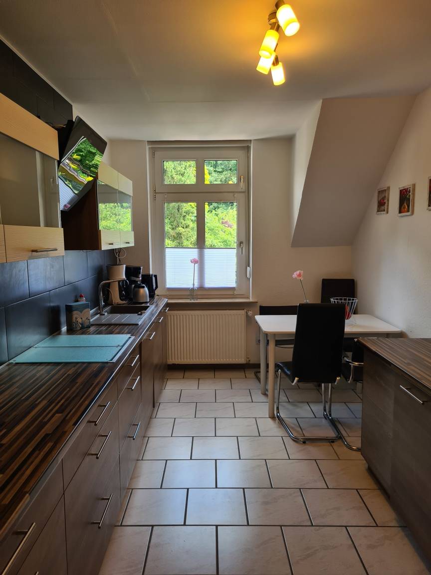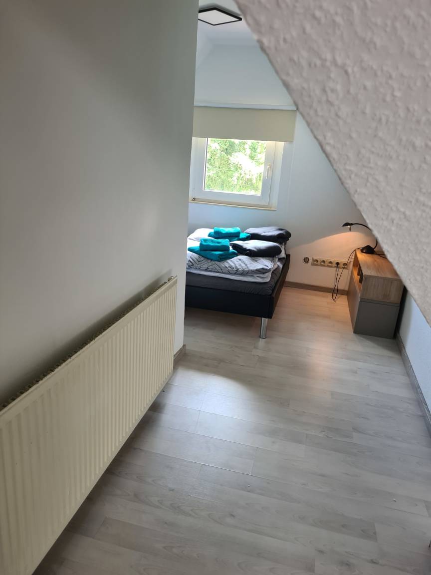Die Nichtraucher-Wohnung liegt ruhig und doch sehr zentral in Marl-Brassert. Sie befindet sich im 1. Obergeschoss mit Dachgeschoss, in einem 3-Parteien-Haus und verfügt über einen separaten Eingang. Dieser ist über eine Wendeltreppe erreichbar, die sich in einer langen Einfahrt befindet und von der Straße aus nicht sichtbar ist. Wenn man die Wohnung betreten hat, geht man - am Gäste-WC vorbei - noch eine Treppe in den eigentlichen Wohnbereich hinauf. Hier befindet sich ein geräumiger Flur. Gleich rechts ist das Bad. Es ist deckenhoch, hell gefliest und mit einem Veluxfenster ausgestattet, welches das Tageslicht hereinlässt. Vom geräumigen Wohn- und Esszimmer aus, kann man die Küche betreten. Sie ist mit einer modernen Einbauküche ausgestattet. Hier hat man einen Blick auf den Garten und die begrünte Halde. Außerdem befindet sich auf dieser Ebene noch ein Schlafzimmer, sowie ein kleiner Abstellraum. Vom Flur aus führt eine halbgewendelte Treppe in das Dachgeschoss zu vier weiteren Schlafmöglichkeiten. Zur Grundausstattung gehören Handtücher und Bettwäsche. W-Lan steht zur Verfügung. Ein Mappe mit der Beschreibung der wichtigsten Ausflugsziele und Attraktionen der Umgebung liegt in der Wohnung.