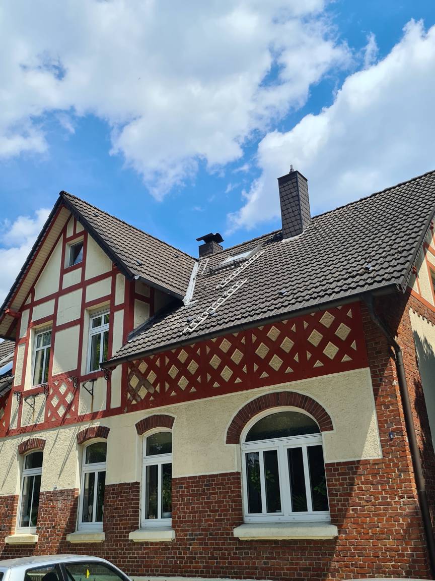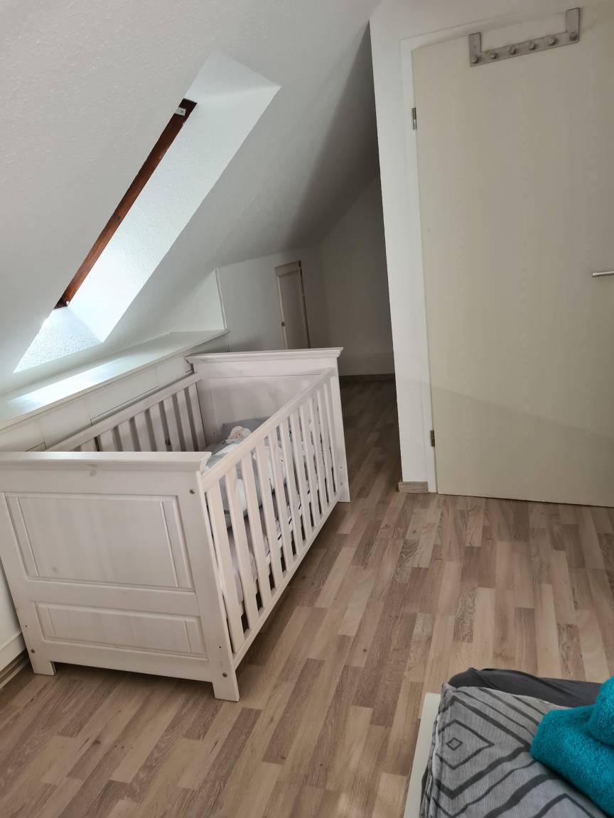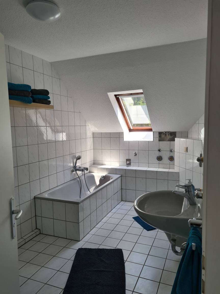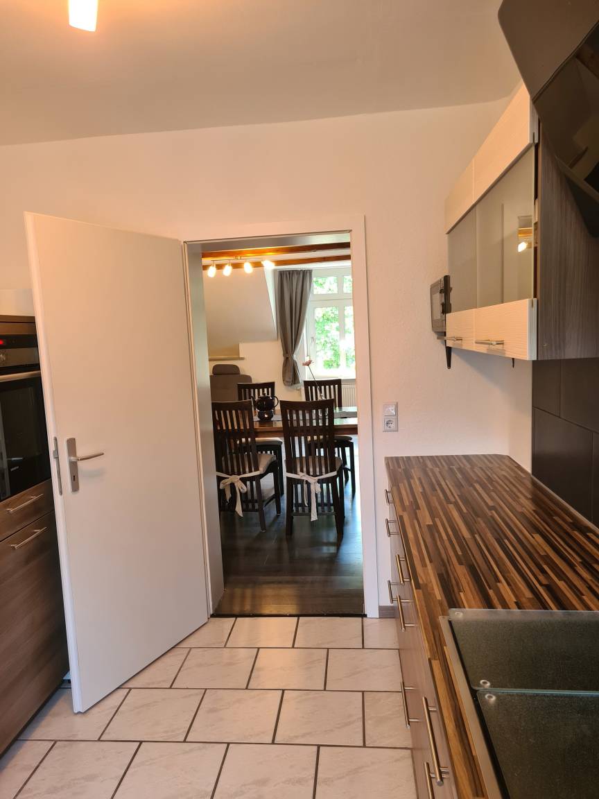 Die Nichtraucher-Wohnung liegt ruhig und doch sehr zentral in Marl-Brassert. Sie befindet sich im 1. Obergeschoss mit Dachgeschoss, in einem 3-Parteien-Haus und verfügt über einen separaten Eingang. Dieser ist über eine Wendeltreppe erreichbar, die sich in einer langen Einfahrt befindet und von der Straße aus nicht sichtbar ist. Wenn man die Wohnung betreten hat, geht man - am Gäste-WC vorbei - noch eine Treppe in den eigentlichen Wohnbereich hinauf. Hier befindet sich ein geräumiger Flur. Gleich rechts ist das Bad. Es ist deckenhoch, hell gefliest und mit einem Veluxfenster ausgestattet, welches das Tageslicht hereinlässt. Vom geräumigen Wohn- und Esszimmer aus, kann man die Küche betreten. Sie ist mit einer modernen Einbauküche ausgestattet. Hier hat man einen Blick auf den Garten und die begrünte Halde. Außerdem befindet sich auf dieser Ebene noch ein Schlafzimmer, sowie ein kleiner Abstellraum. Vom Flur aus führt eine halbgewendelte Treppe in das Dachgeschoss zu vier weiteren Schlafmöglichkeiten. Zur Grundausstattung gehören Handtücher und Bettwäsche. W-Lan steht zur Verfügung. Ein Mappe mit der Beschreibung der wichtigsten Ausflugsziele und Attraktionen der Umgebung liegt in der Wohnung.
