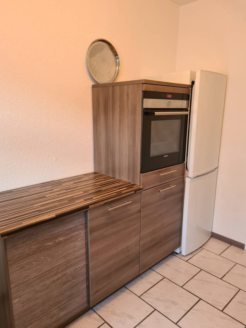 Die Küche ist mit einer Einbauküche ausgestattet. Ein Herd mit Dunstabzugshaube, eine Spülmaschine, eine Mirkowelle und ein Kühlschrank mit drei Gefrierschubladen gehören zur Ausstattung.