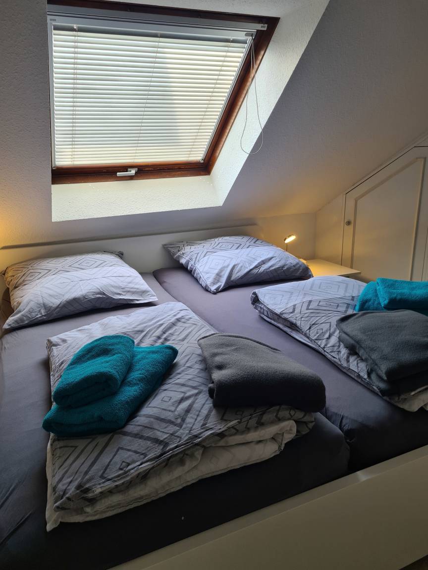 In diesem Raum steht ein großes Doppelbett mit Nachtschränken. In die Dachschrägen wurden Einbauschränke eingepasst, die den vorhanden Platz optimal nutzbar machen. Beide Veluxfenster lassen sich durch eine Jalousie bzw. ein Rollo abdunkeln. Zur Ausstattung gehört auch ein Kinderbett, welches bei Bedarf genutzt werden kann. Über einen kleinen Winkelzugang kommt man in ein schnuckliges Erkerzimmer. Hier steht ein 140x200 cm Bett. Hier kann das Fenster mit einem Innenrollo verdunkelt werden. Trotz guter Dämmung kann es im Dachgeschoss schon etwas wärmer werden. Aus diesem Grund gehören 2 Säulenventilatoren zur Ausstattung.