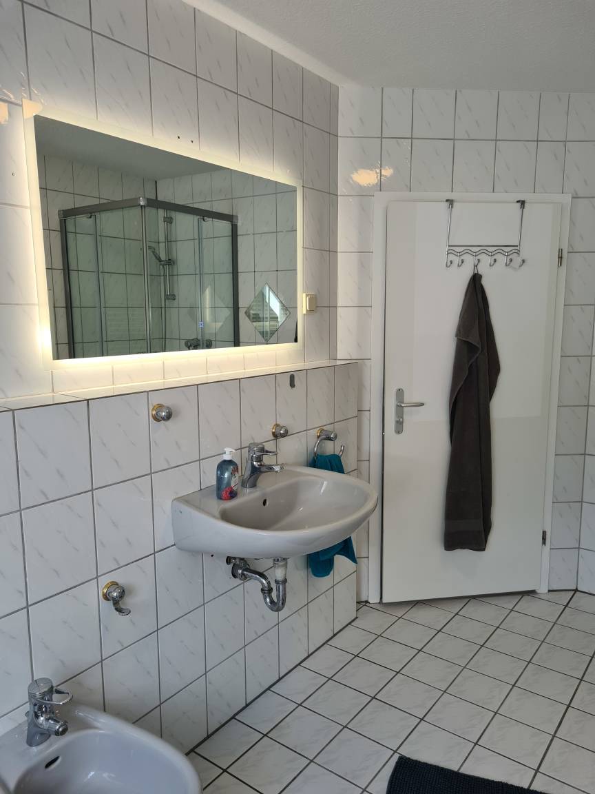 Das Badezimmer ist deckenhoch, hell gefliest. Über dem Waschbecken hängt ein großer LED-Spiegel. Bidet, Toilette, Badewanne und Dusche mit Glaseckeinstieg statten das Badezimmer vollumfänglich aus. Außerdem gehört noch eine Waschmaschine, sowie ein Fön zu Ausstattung. Es gibt ein zusätzliches Gäste-WC im Eingangsbereich.
