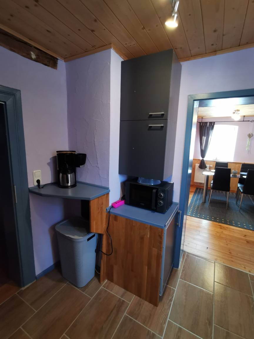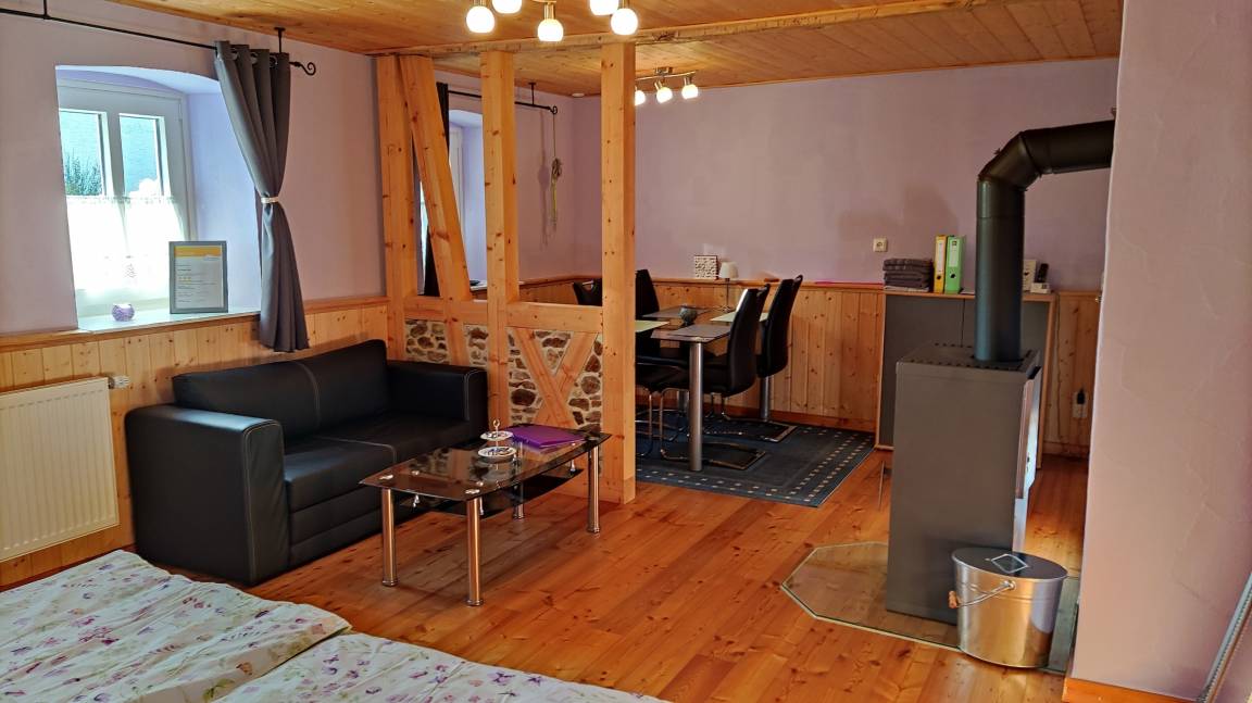 Die liebevoll eingerichtete und gemütliche Ferienwohnung im Landhausstil wird Ihr Domizil sein. Die Echtholzmöbel und das großzügig verarbeitete Holz sorgen für ein angenehmes Wohnklima. Der Schwedenofen sorgt in kalten Zeiten für ein romantisches Ambiente und eine kuschelige Wärme. Der großzügig geschnittene Wohn-Schlafraum lässt keine Wünsche offen. Abgerundet wird das Ganze durch kostenfreies WLAN, ein Festnetztelefon und einen SAT-TV mit integrierten DVD-Player. Die Küche ist voll ausgestattet und besitzt eine Spülmaschine, eine Mikrowelle, eine Kaffeemaschine und eine Senseo-Kaffeemaschine. Auch um Spülmittel, Spüllappen und Geschirrtücher müssen Sie sich nicht sorgen. Das Bad, welches ausschließlich von Ihnen genutzt wird, verfügt über eine Dusche, ein WC und ein Handwaschbecken. Handtücher, Bettwäsche und Fön werden kostenfrei gestellt.
