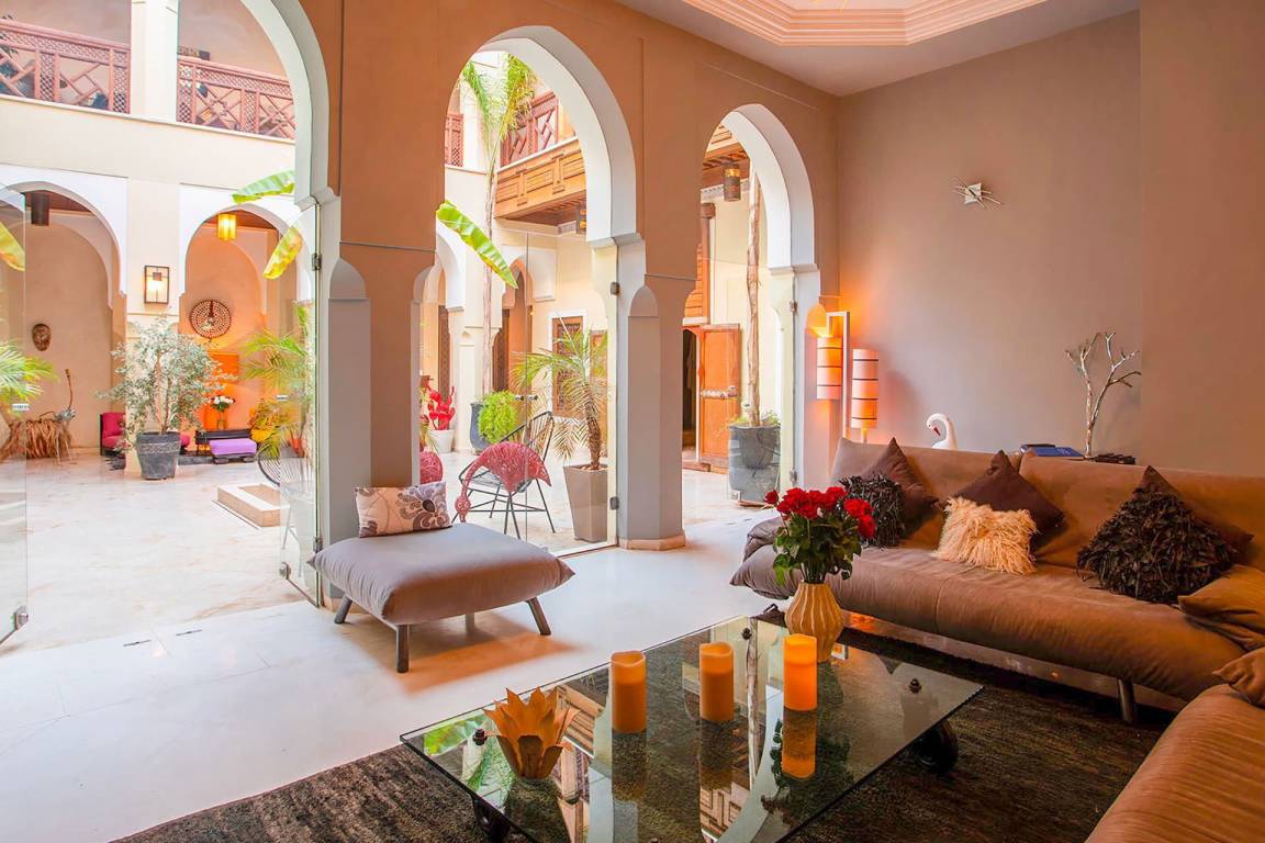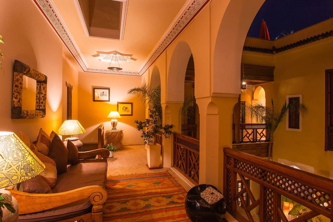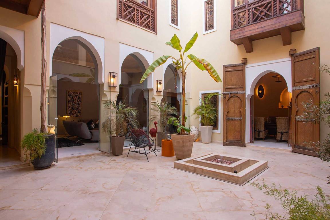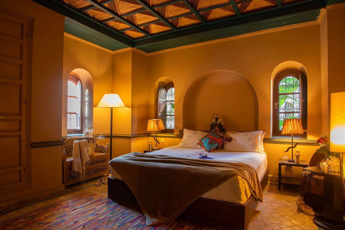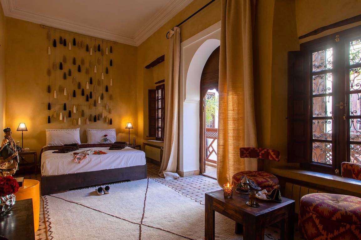Das Riad Ikram ist ein traditionelles marokkanisches Riad mit einer Gesamtfläche von 6 Schlafzimmern und 6 Bädern, verteilt auf mehrere Geschosse, und bietet Platz für bis zu 12 Gäste. Die Räume sind um einen zentralen Innenhof angeordnet, der der klassischen Architektur der Medina entspricht und einen intimen Rückzugsraum schafft. Jedes Schlafzimmer ist mit traditioneller marokkanischer Handwerkskunst und modernem Komfort ausgestattet und verfügt über ein eigenes Bad. Die oberen Geschosse führen zu einer Panoramaterrasse mit Blick über die Dächer von Marrakesch.