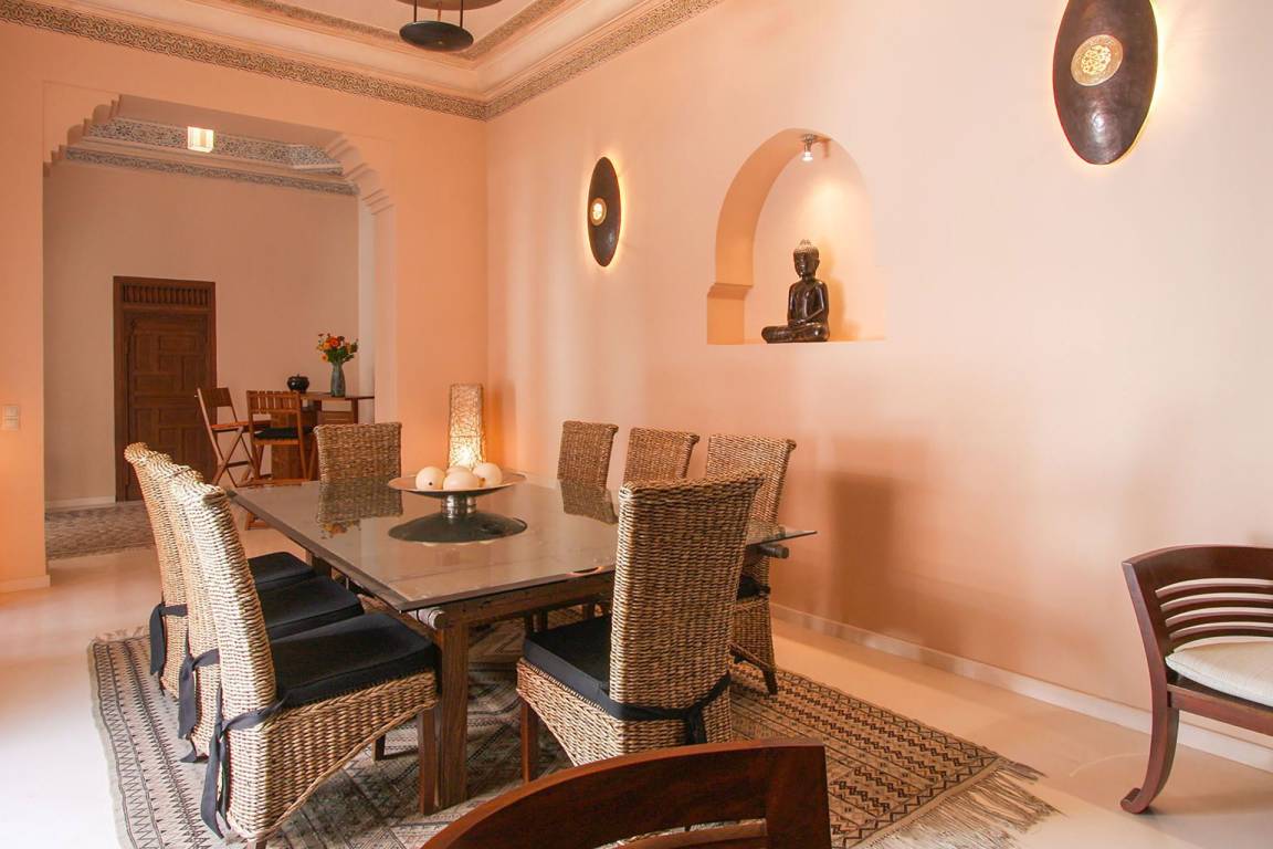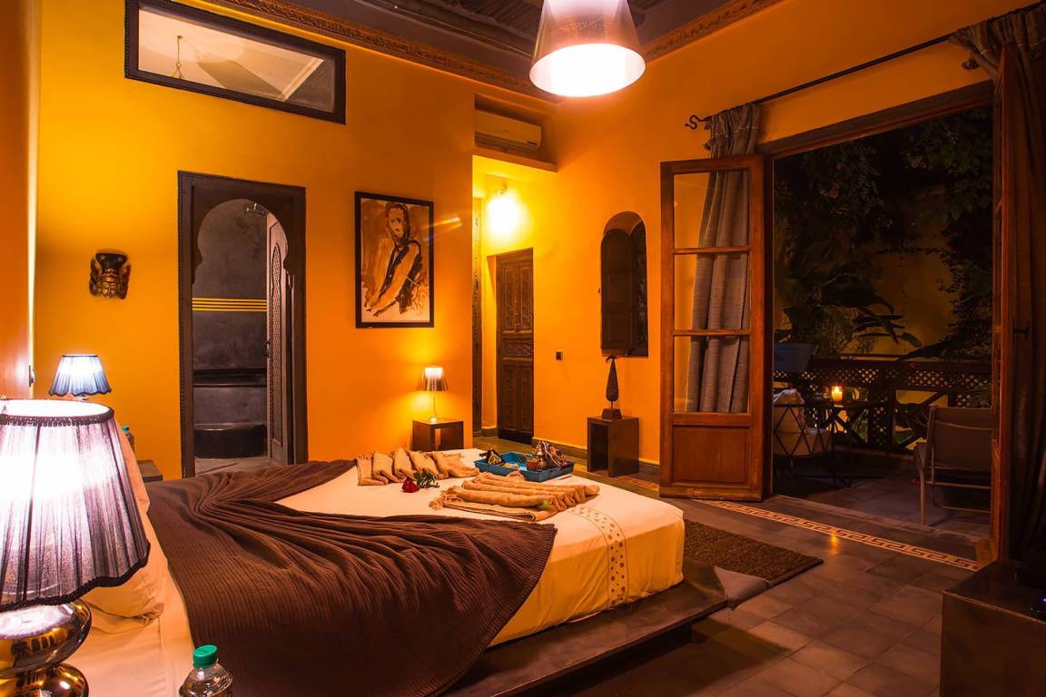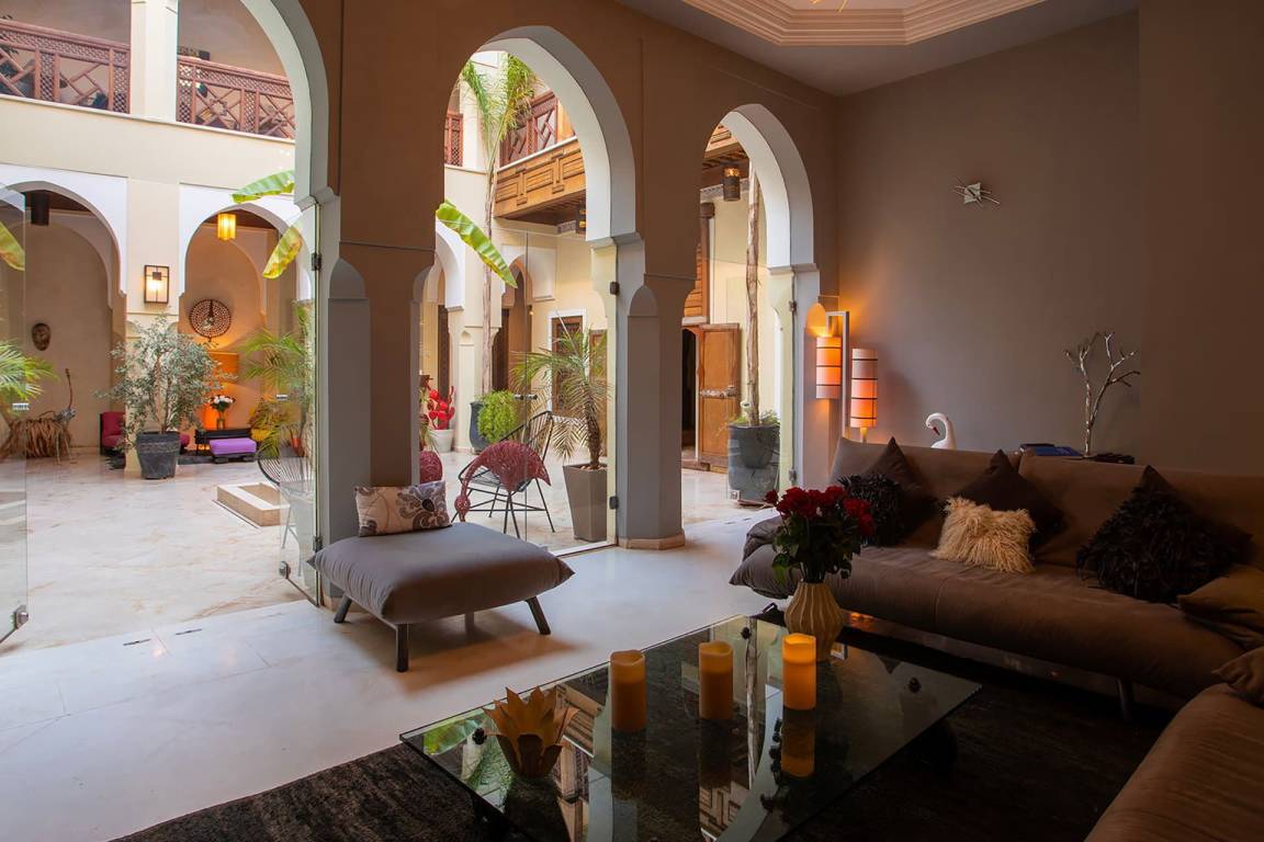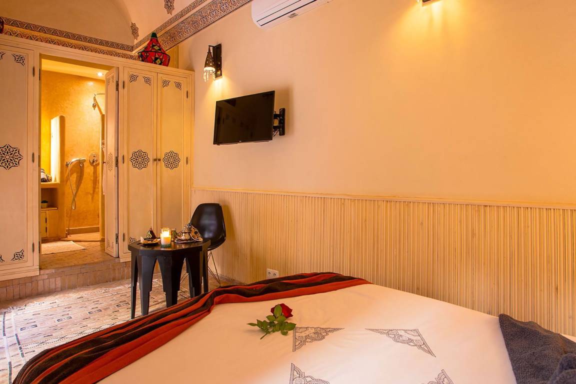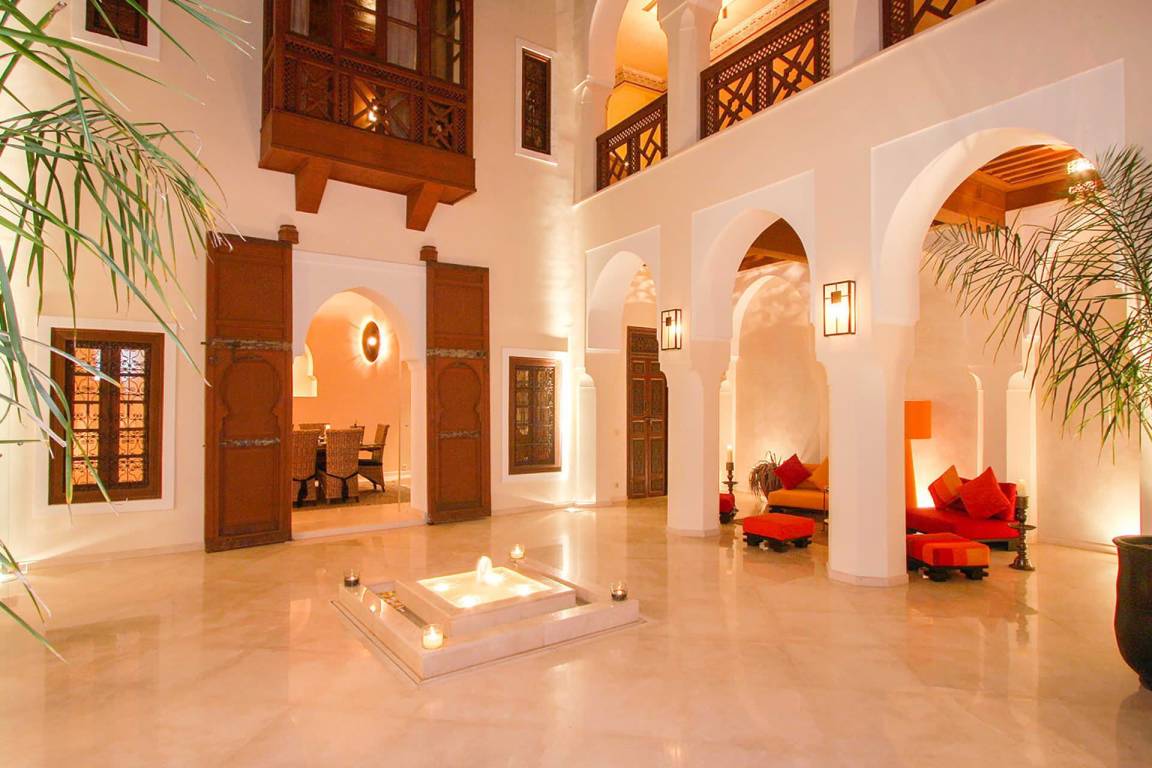 Das Riad Ikram ist ein traditionelles marokkanisches Riad mit einer Gesamtfläche von 6 Schlafzimmern und 6 Bädern, verteilt auf mehrere Geschosse, und bietet Platz für bis zu 12 Gäste. Die Räume sind um einen zentralen Innenhof angeordnet, der der klassischen Architektur der Medina entspricht und einen intimen Rückzugsraum schafft. Jedes Schlafzimmer ist mit traditioneller marokkanischer Handwerkskunst und modernem Komfort ausgestattet und verfügt über ein eigenes Bad. Die oberen Geschosse führen zu einer Panoramaterrasse mit Blick über die Dächer von Marrakesch.