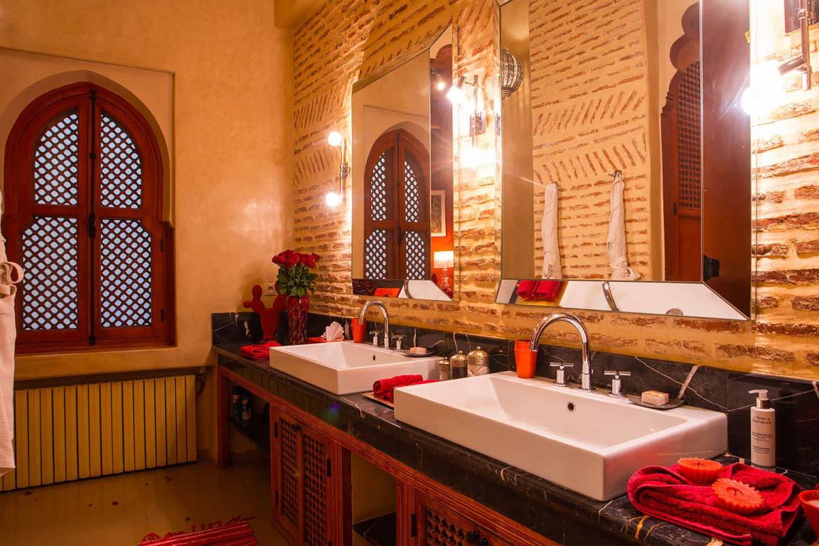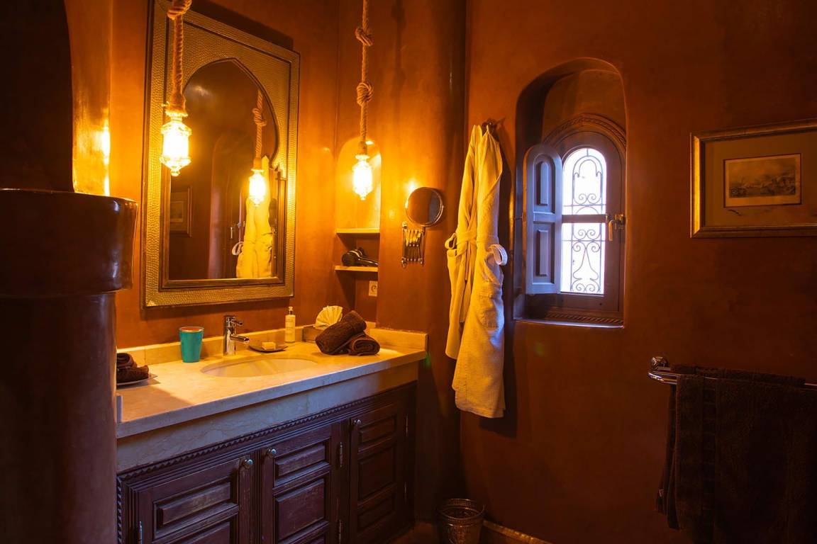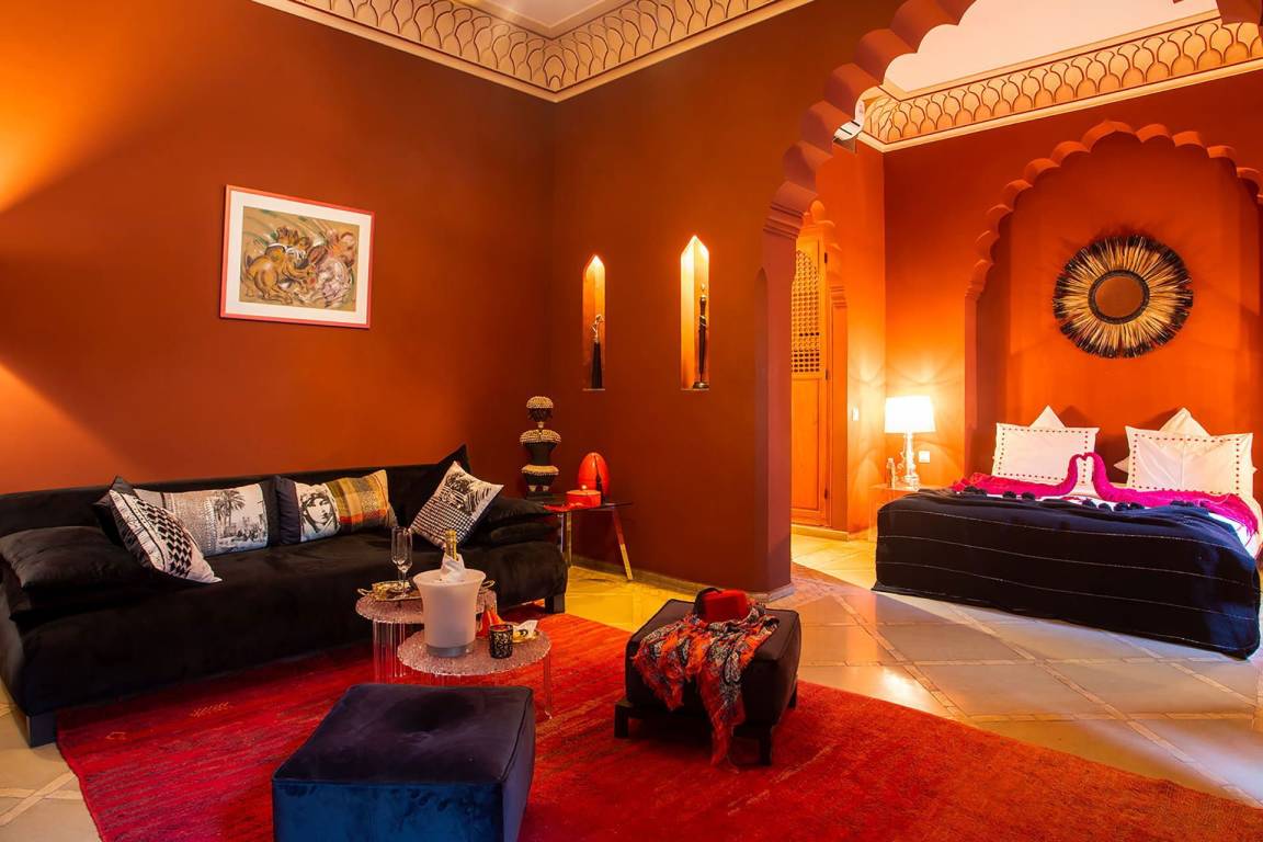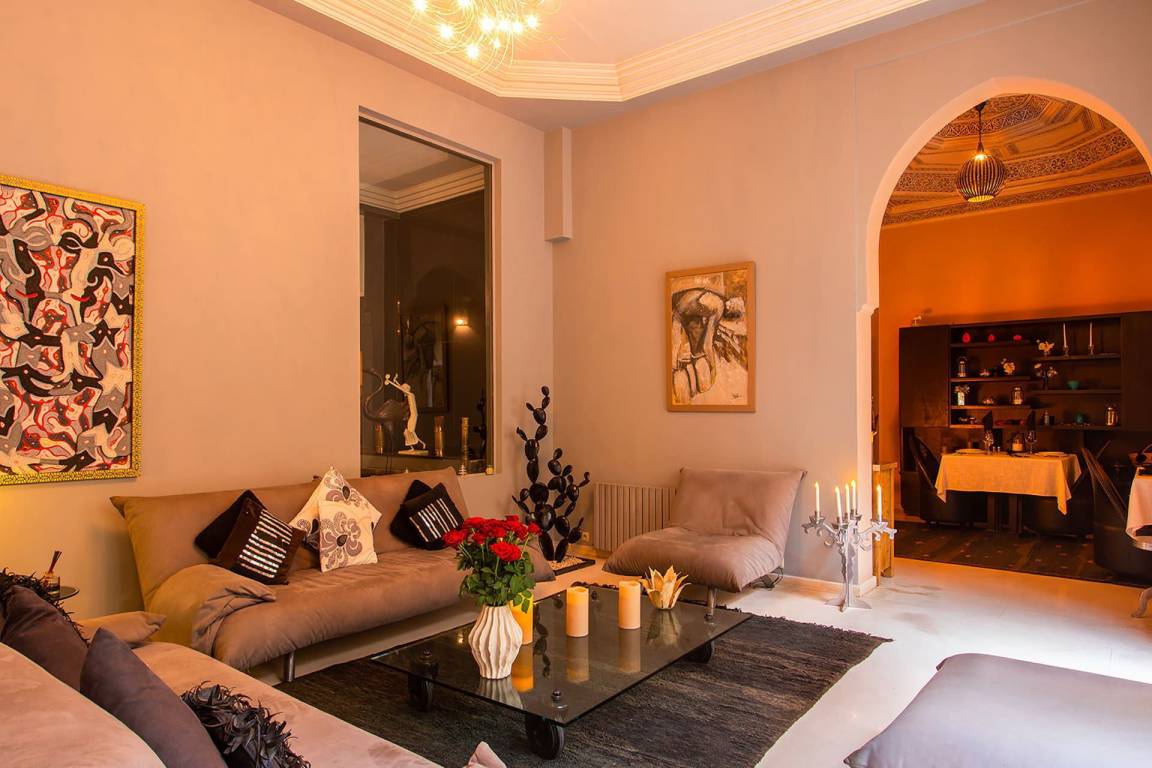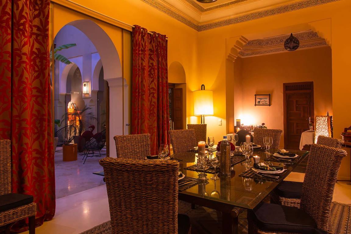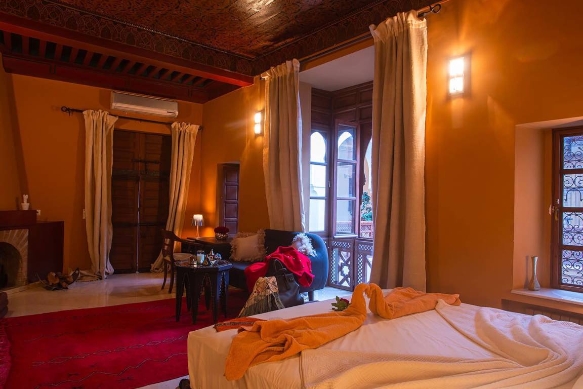 Das Riad Ikram ist ein traditionelles marokkanisches Riad mit einer Gesamtfläche von 6 Schlafzimmern und 6 Bädern, verteilt auf mehrere Geschosse, und bietet Platz für bis zu 12 Gäste. Die Räume sind um einen zentralen Innenhof angeordnet, der der klassischen Architektur der Medina entspricht und einen intimen Rückzugsraum schafft. Jedes Schlafzimmer ist mit traditioneller marokkanischer Handwerkskunst und modernem Komfort ausgestattet und verfügt über ein eigenes Bad. Die oberen Geschosse führen zu einer Panoramaterrasse mit Blick über die Dächer von Marrakesch.
