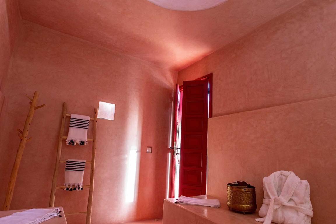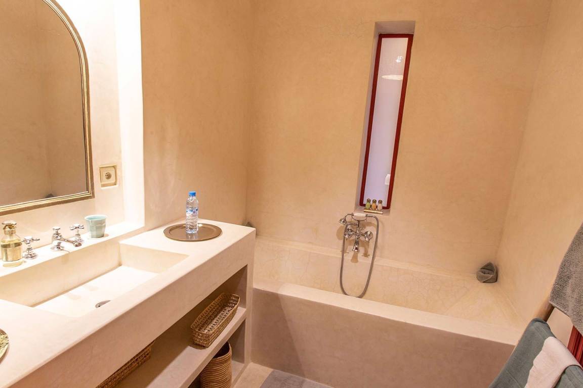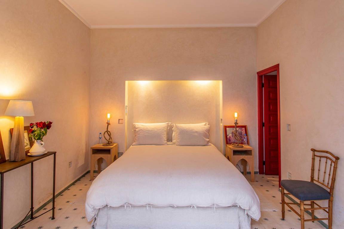 Dar Splendid ist ein Riad mit insgesamt 5 Schlafzimmern und 5 Bädern für bis zu 10 Gäste, verteilt über mehrere Geschosse. Die Schlafzimmer sind großzügig geschnitten und elegant möbliert. Die 5 Bäder sind über die verschiedenen Ebenen des Hauses verteilt und bedienen die einzelnen Schlafbereiche.
