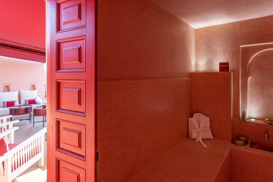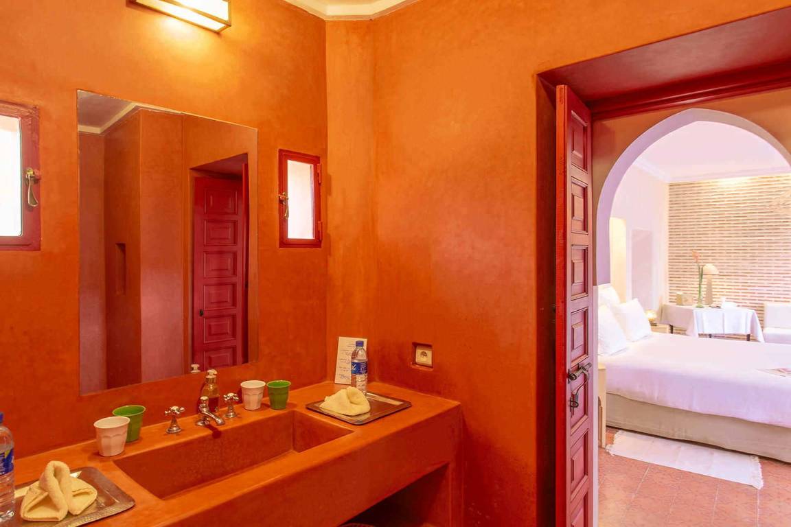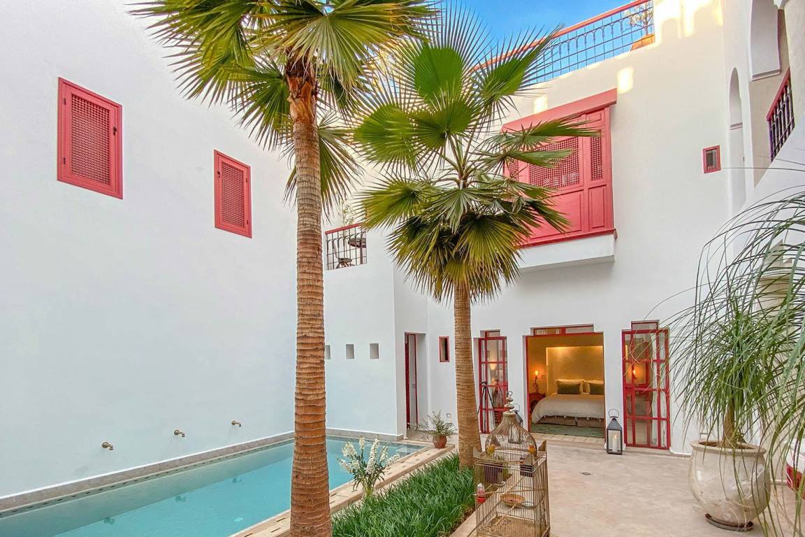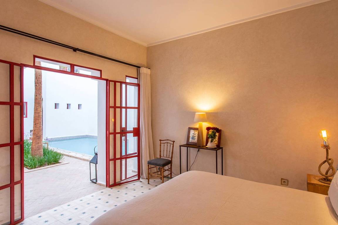 Dar Splendid ist ein Riad mit insgesamt 5 Schlafzimmern und 5 Bädern für bis zu 10 Gäste, verteilt über mehrere Geschosse. Die Schlafzimmer sind großzügig geschnitten und elegant möbliert. Die 5 Bäder sind über die verschiedenen Ebenen des Hauses verteilt und bedienen die einzelnen Schlafbereiche.