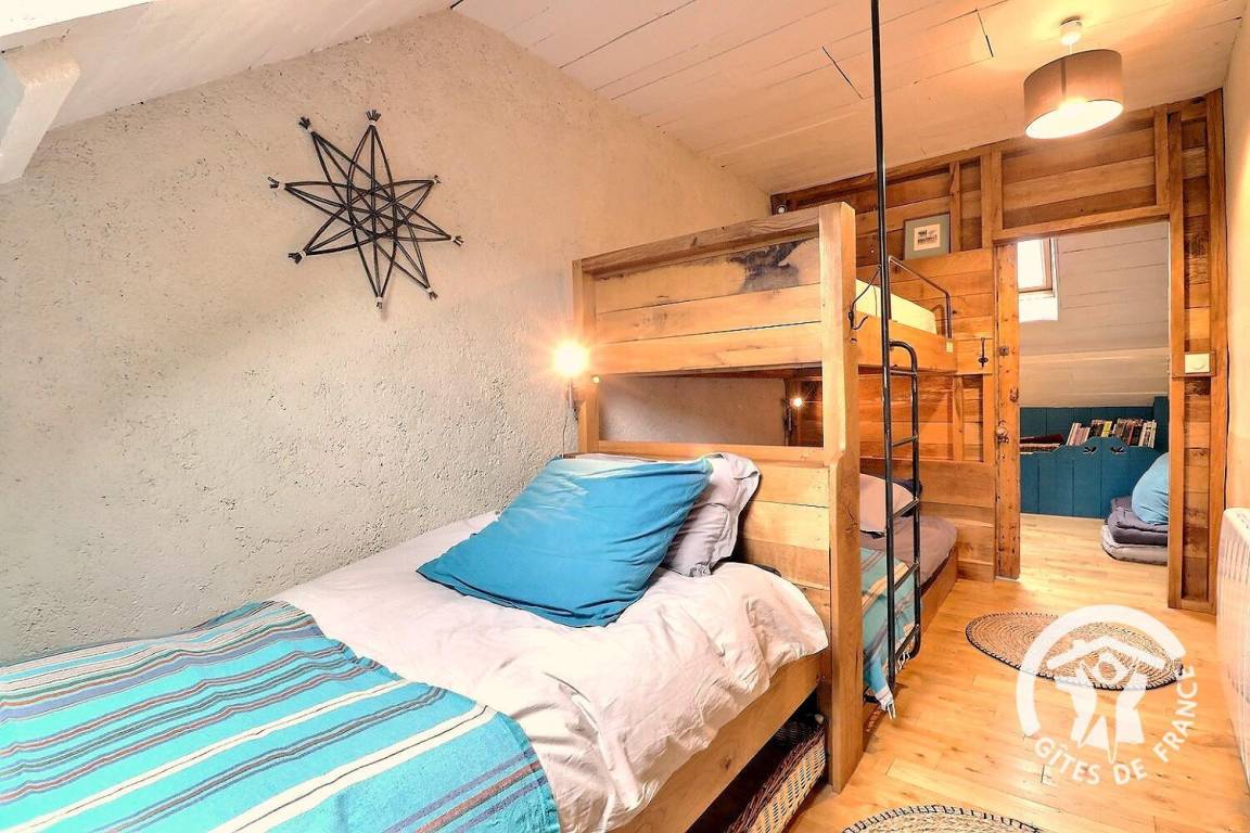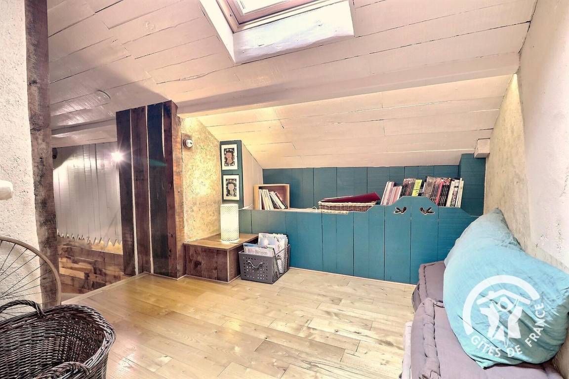 Ein Dachboden mit Leseecke bietet Zugang zu einem Schlafzimmer mit drei Betten (9 Personen), darunter ein Etagenbett.