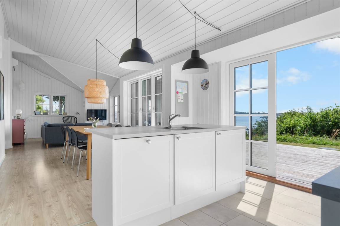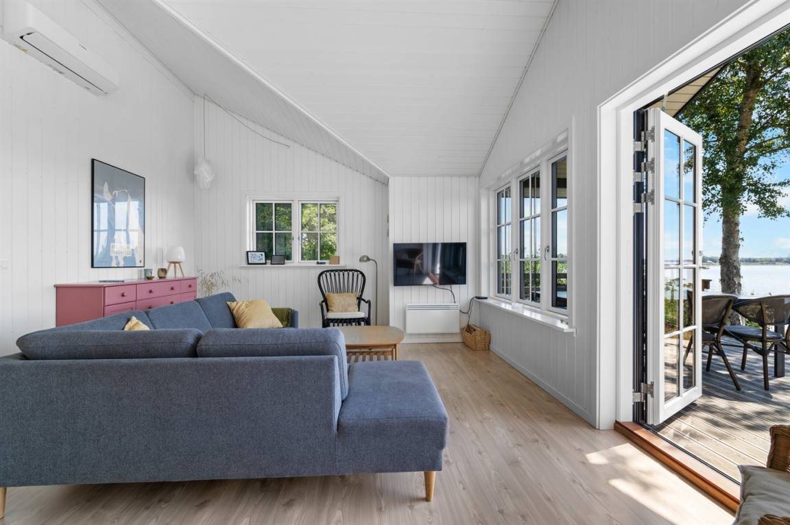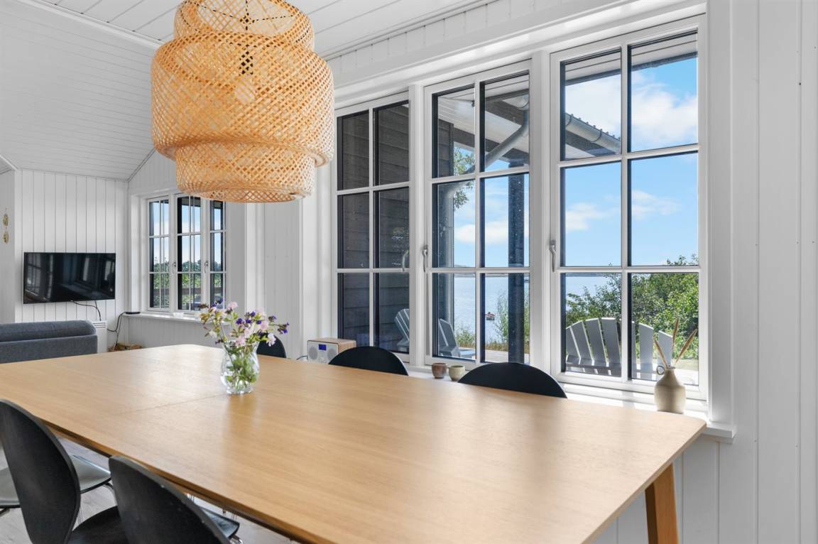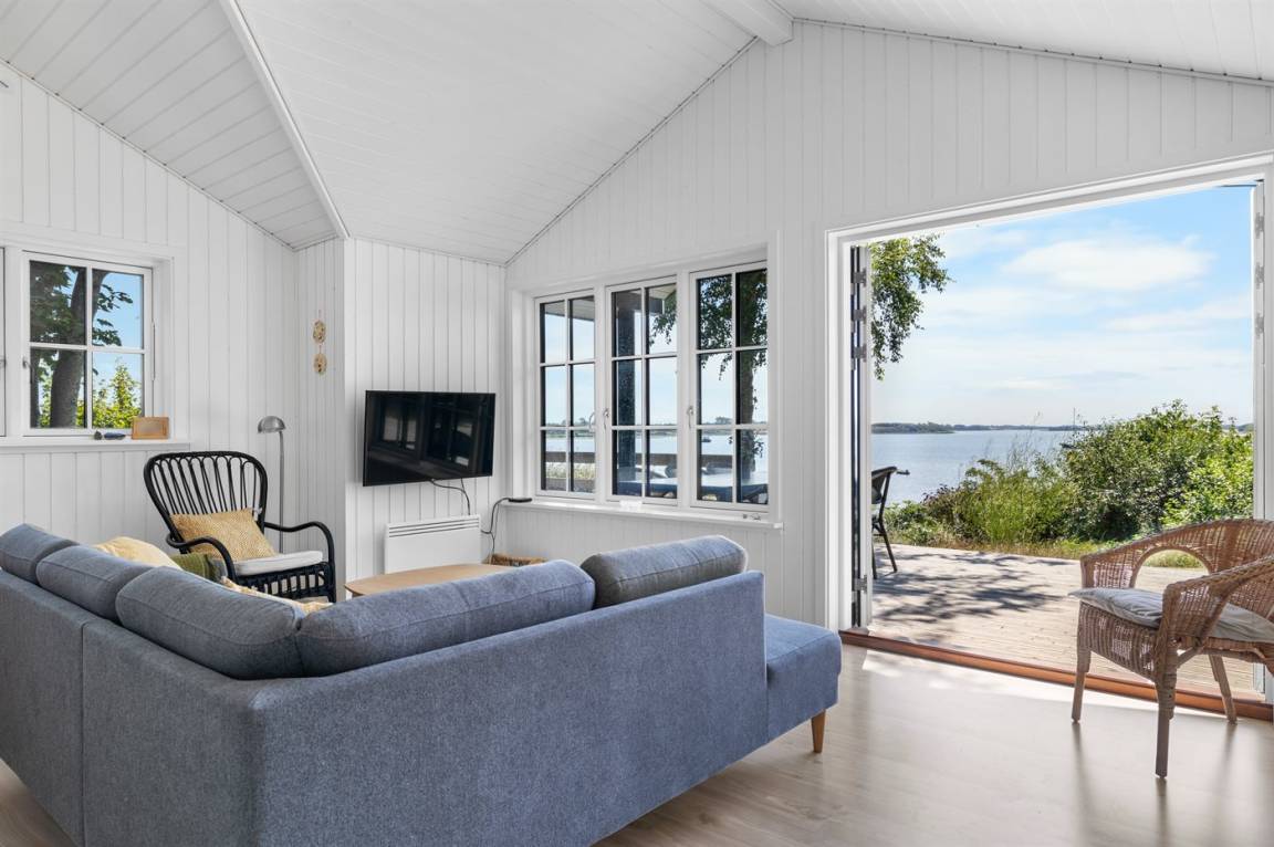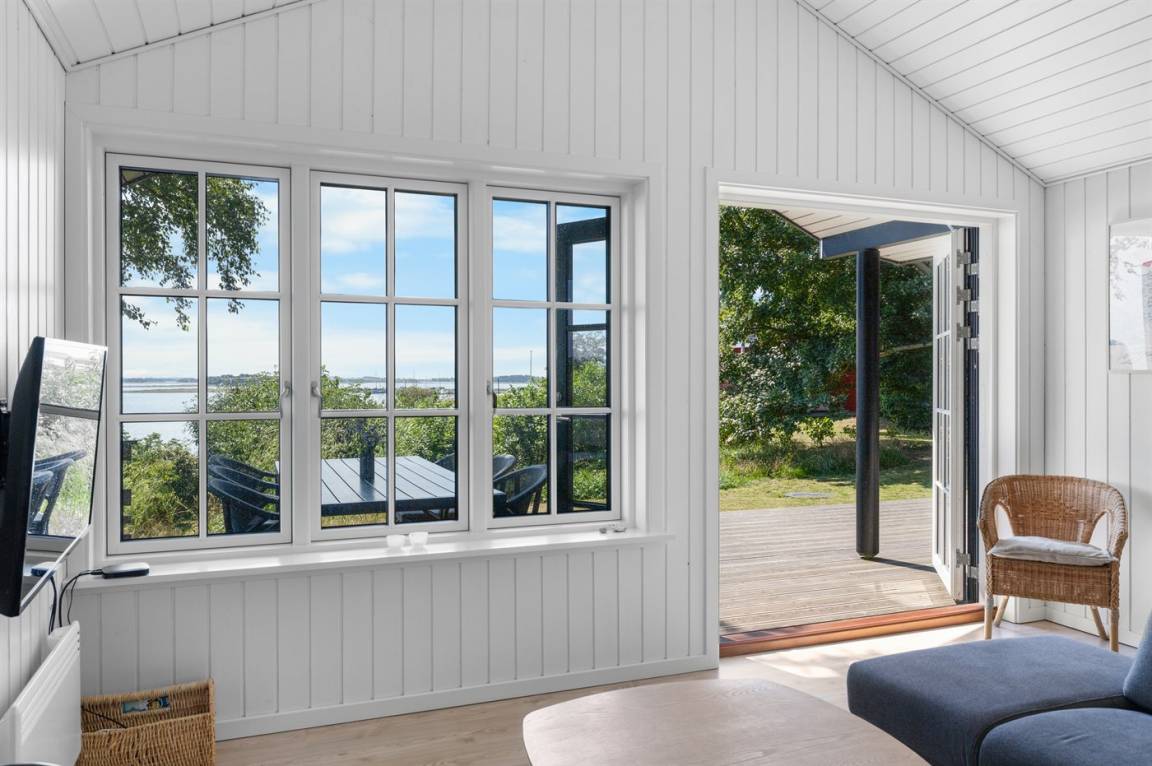 Von der großen, nach Süden ausgerichteten und teilweise überdachten Terrasse sowie vom Inneren des Hauses hast du einen herrlichen Blick über das Wasser und die Umgebung.