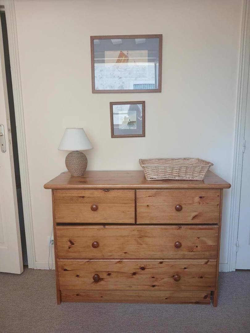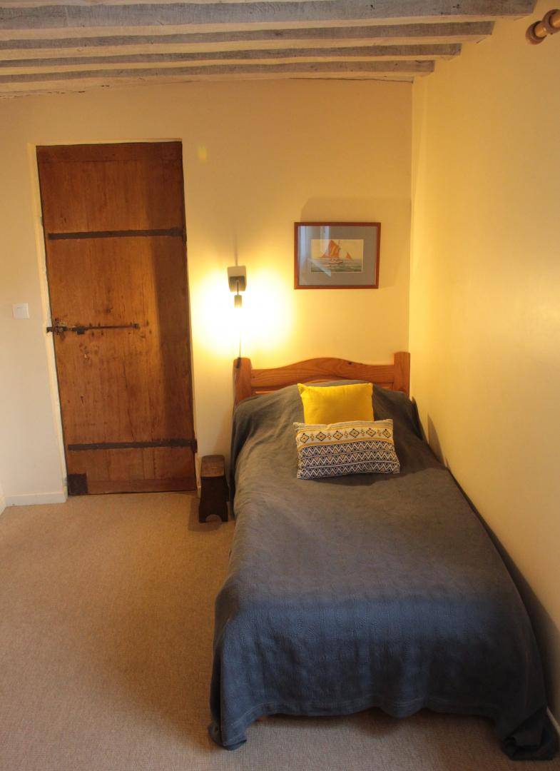 Im Obergeschoss: Geräumiger Flur mit Einzelbett (90 x 190), Seegrasboden. Badezimmer mit Dusche und Waschmaschine. Separate Toilette. Schlafzimmer mit zwei zusammengeschobenen Einzelbetten (80 x 190), Seegrasboden.