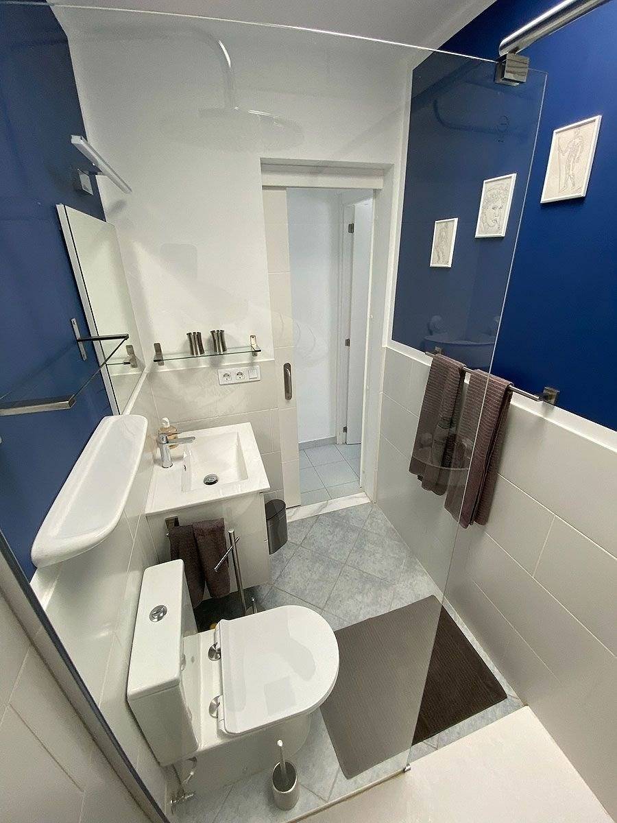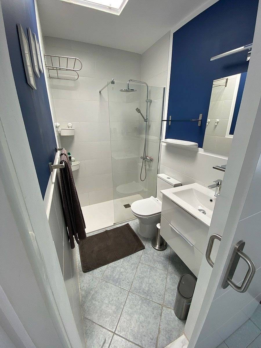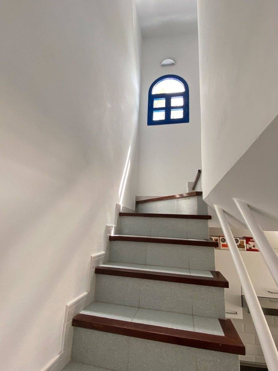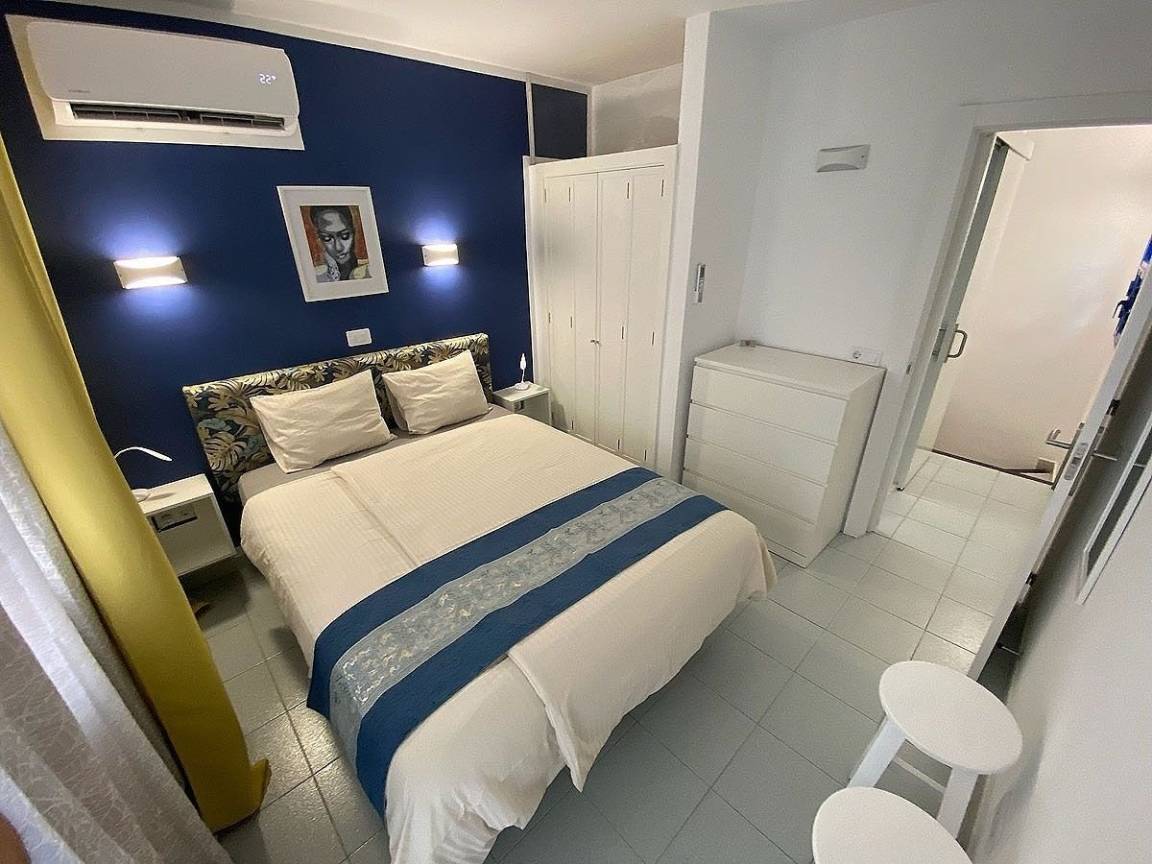 Im Obergeschoss befindet sich das Schlafzimmer mit Doppelbett (150 x 200 cm), Klimaanlage und kleinem Balkon sowie das Badezimmer mit Toilette und Dusche. 1 Set Handtücher pro Person (2 Dusch- und 2 Handtücher) sowie Bettwäsche sind im Mietpreis inkludiert (ein Wäschewechsel während Ihres Aufenthalts findet nicht statt).