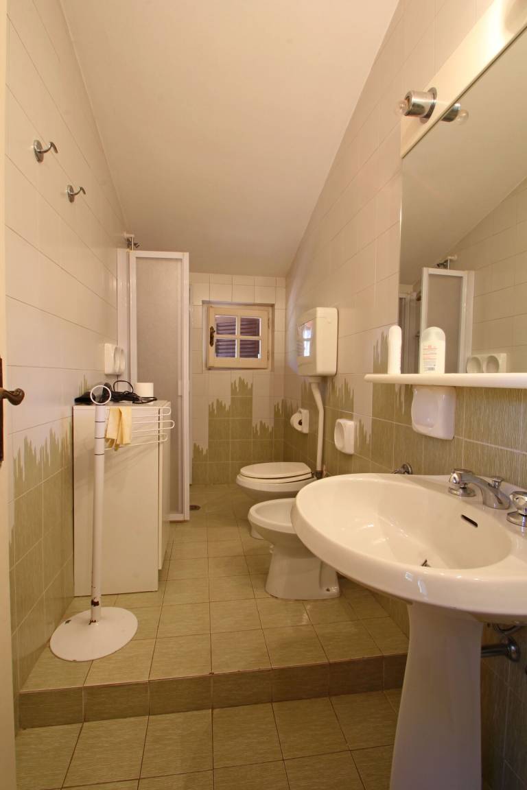 Badezimmer: Waschbecken, WC, Bidet, Dusche, Fön, Waschmaschine.
