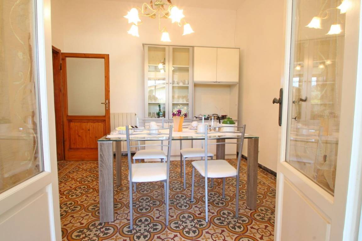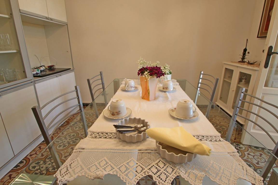 Küche: Esstisch (Personen: 4), Kühlschrank, Tiefkühler, Herd, Ofen, Toaster, Italienische Kaffeemaschine, Ausgang auf die Terrasse.