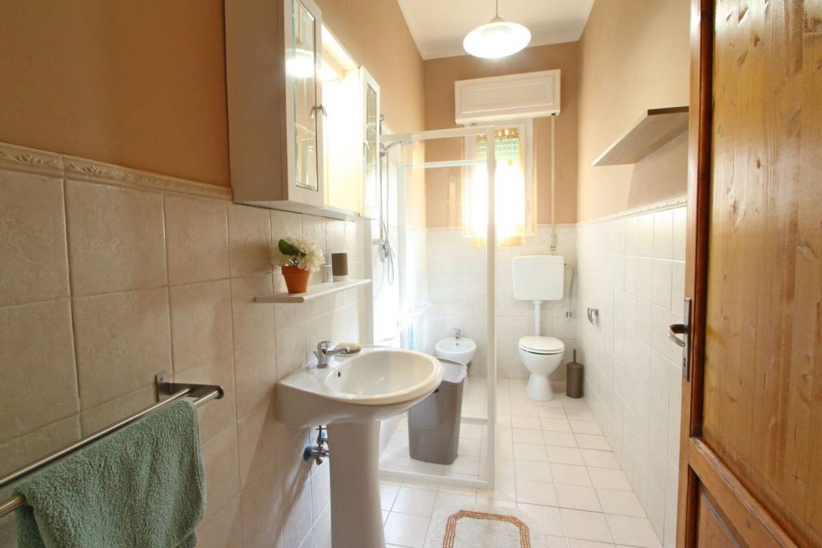 Badezimmer: Waschbecken, WC, Bidet, Dusche.