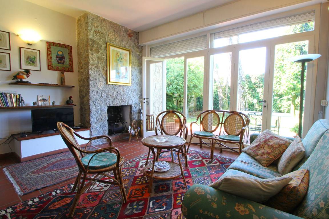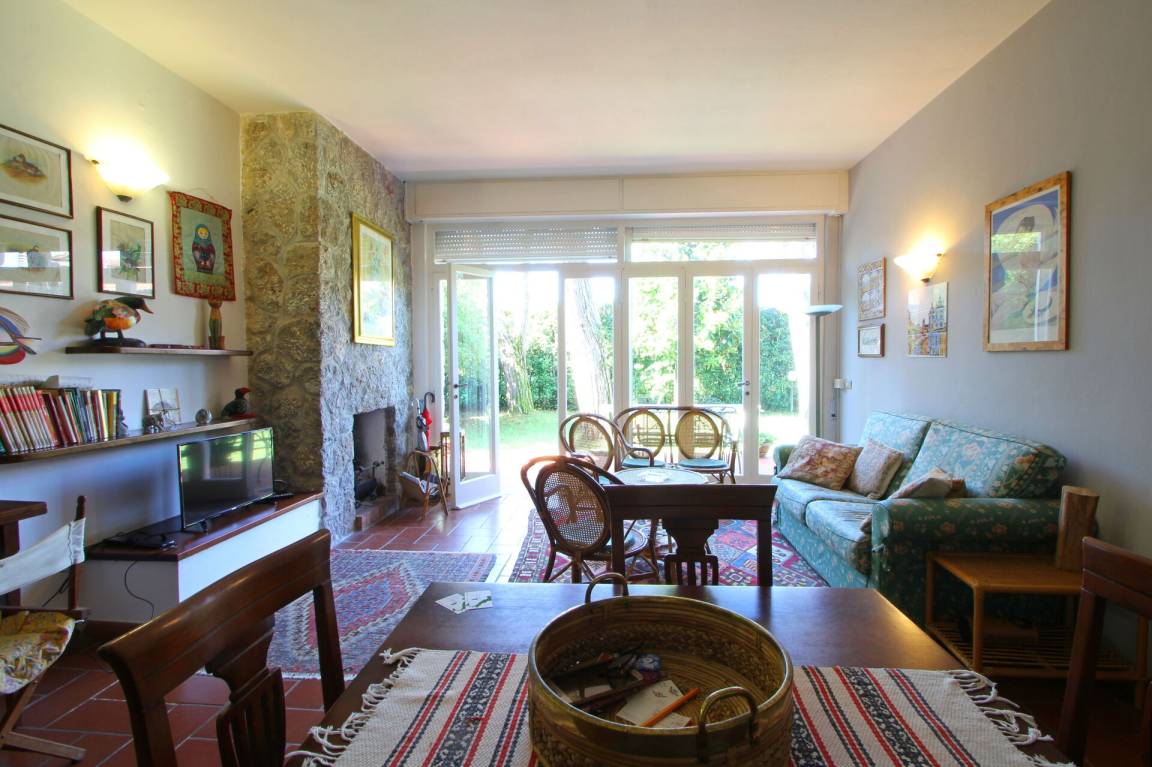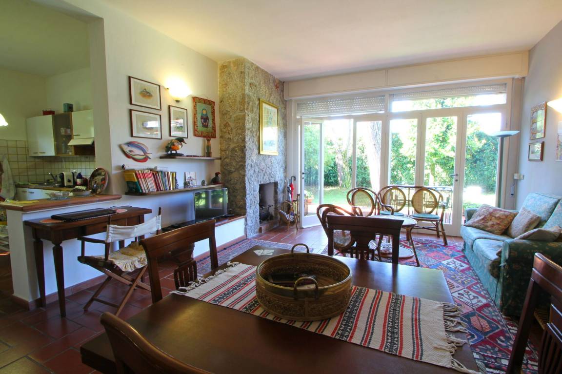 Wohnzimmer: Sofa, Kamin, Esstisch, TV, Ausgang auf den Garten.
