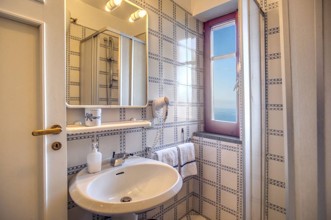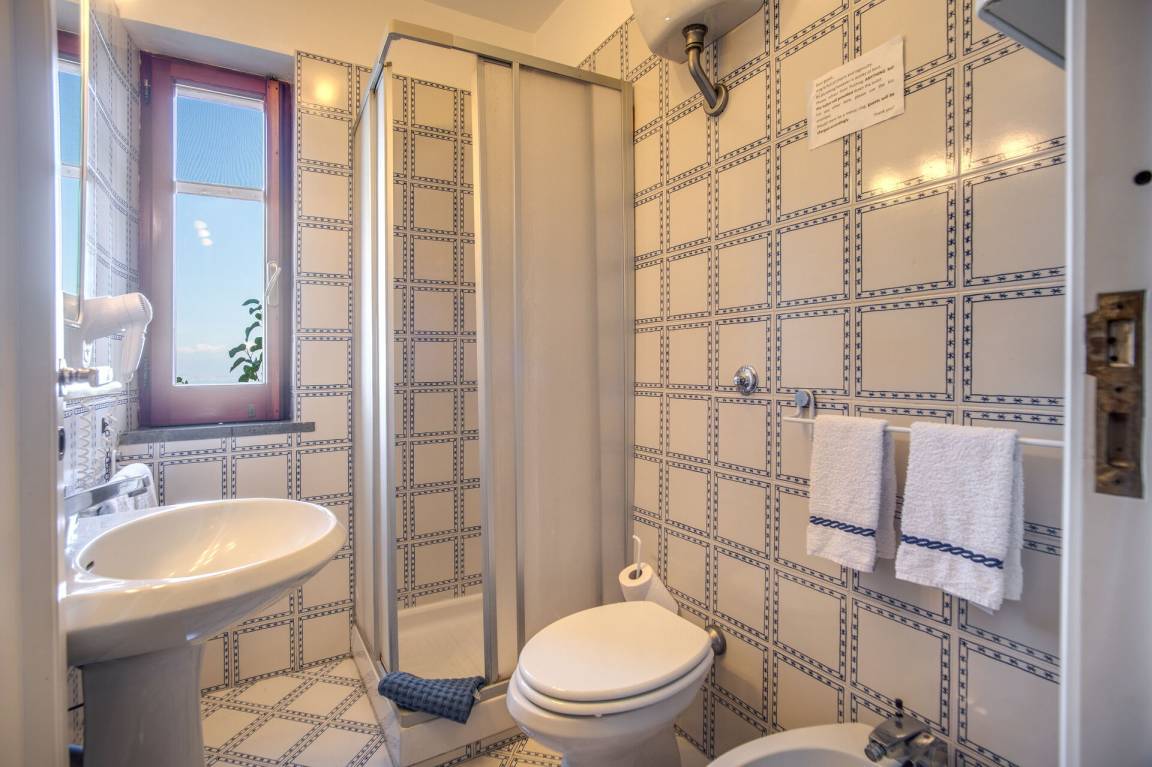 Schlafzimmer mit Bad: Einzelbett, WiFi Internet, Deckenventilator, Waschbecken, WC, Bidet, Dusche.