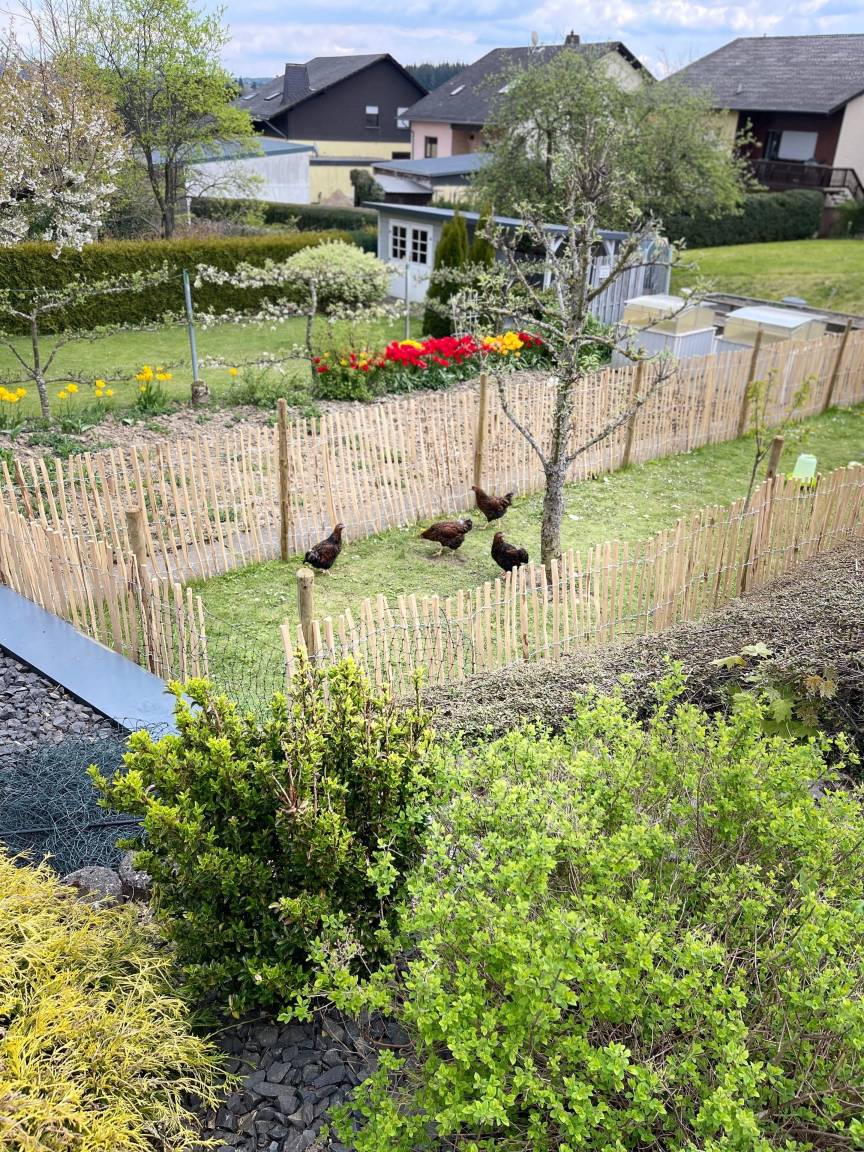 Ihr wohnt direkt am / im Garten. Sogar Ferienhaushühner sind in euer Nachbarschaft.