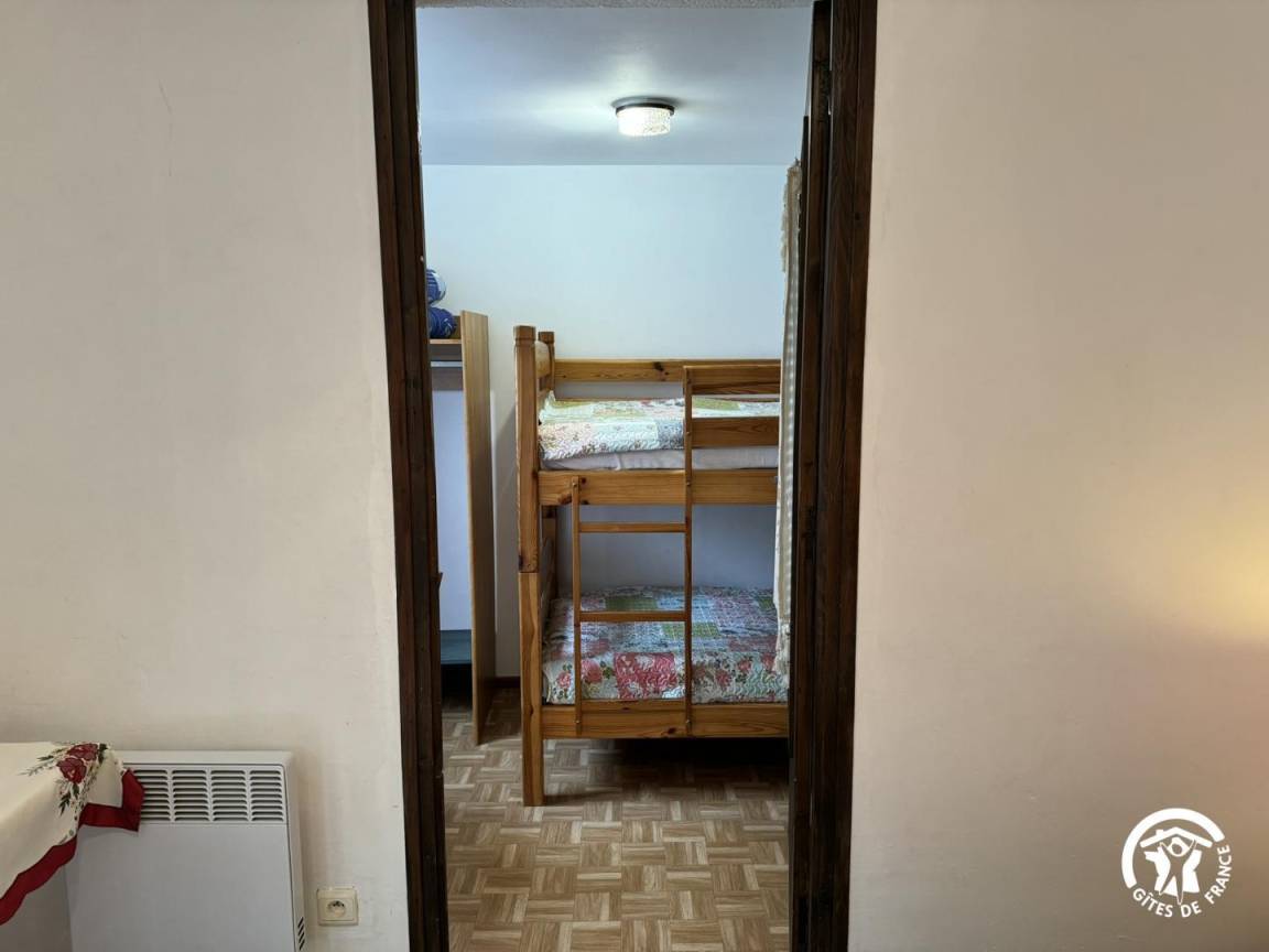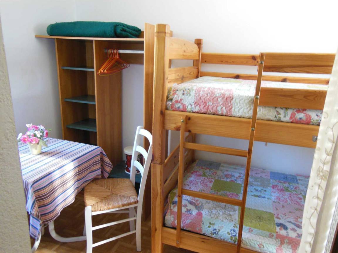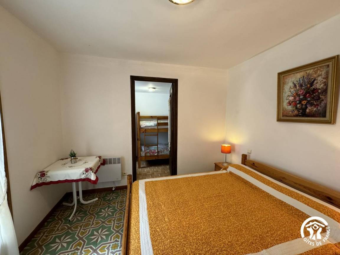 Ein Schlafzimmer verfügt über ein Doppelbett (140 x 190 cm) und ist mit einem kleineren Schlafzimmer mit zwei Etagenbetten (90 x 190 cm) verbunden.